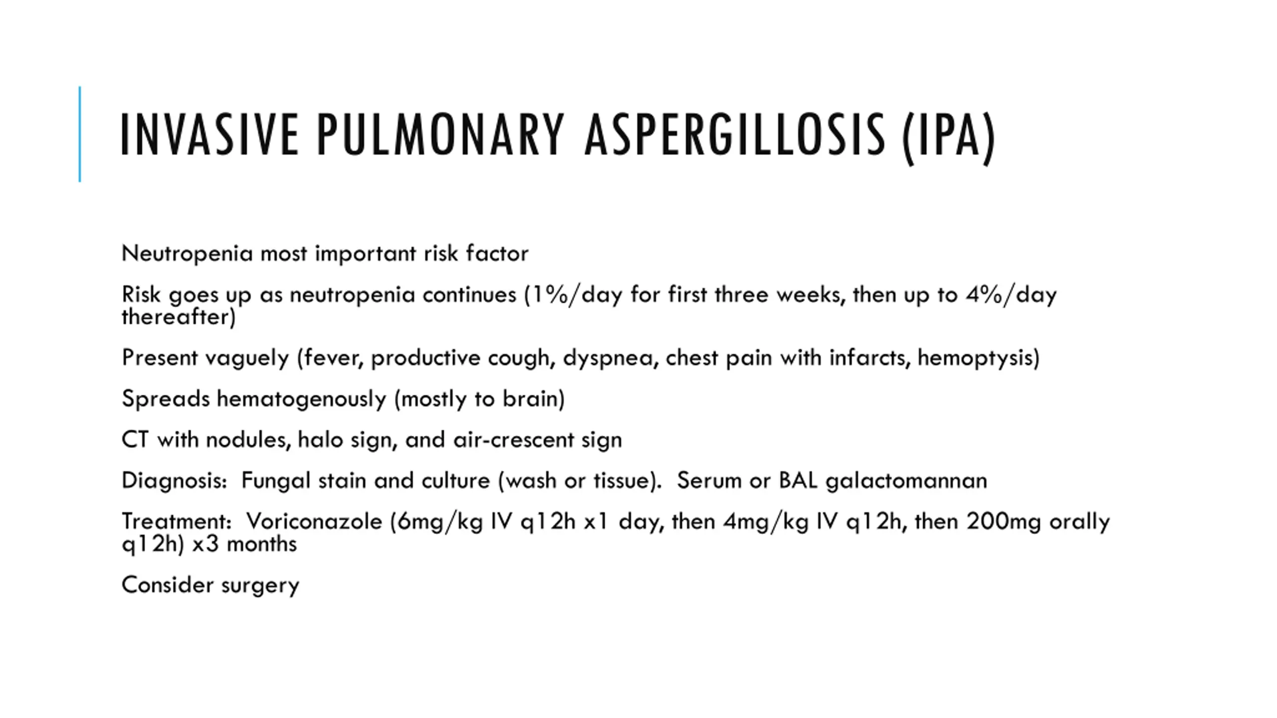 INVASIVE PULMONARY ASPERGILLOSIS (IPA) Neutropenia most important risk factor Risk goes up as neutropenia continues (1%/day for first three weeks, then up to 4%/day thereafter) Present vaguely (fever, productive cough, dyspnea, chest pain with infarcts, hemoptysis) Spreads hematogenously (mostly to brain) CT with nodules, halo sign, and air-crescent sign Diagnosis: Fungal stain and culture (wash or tissue). Serum or BAL galactomannan Treatment: Voriconazole (6mg/kg IV q12h x1 day, then 4mg/kg IV q12h, then 200mg orally q12h) x3 months Consider surgery
