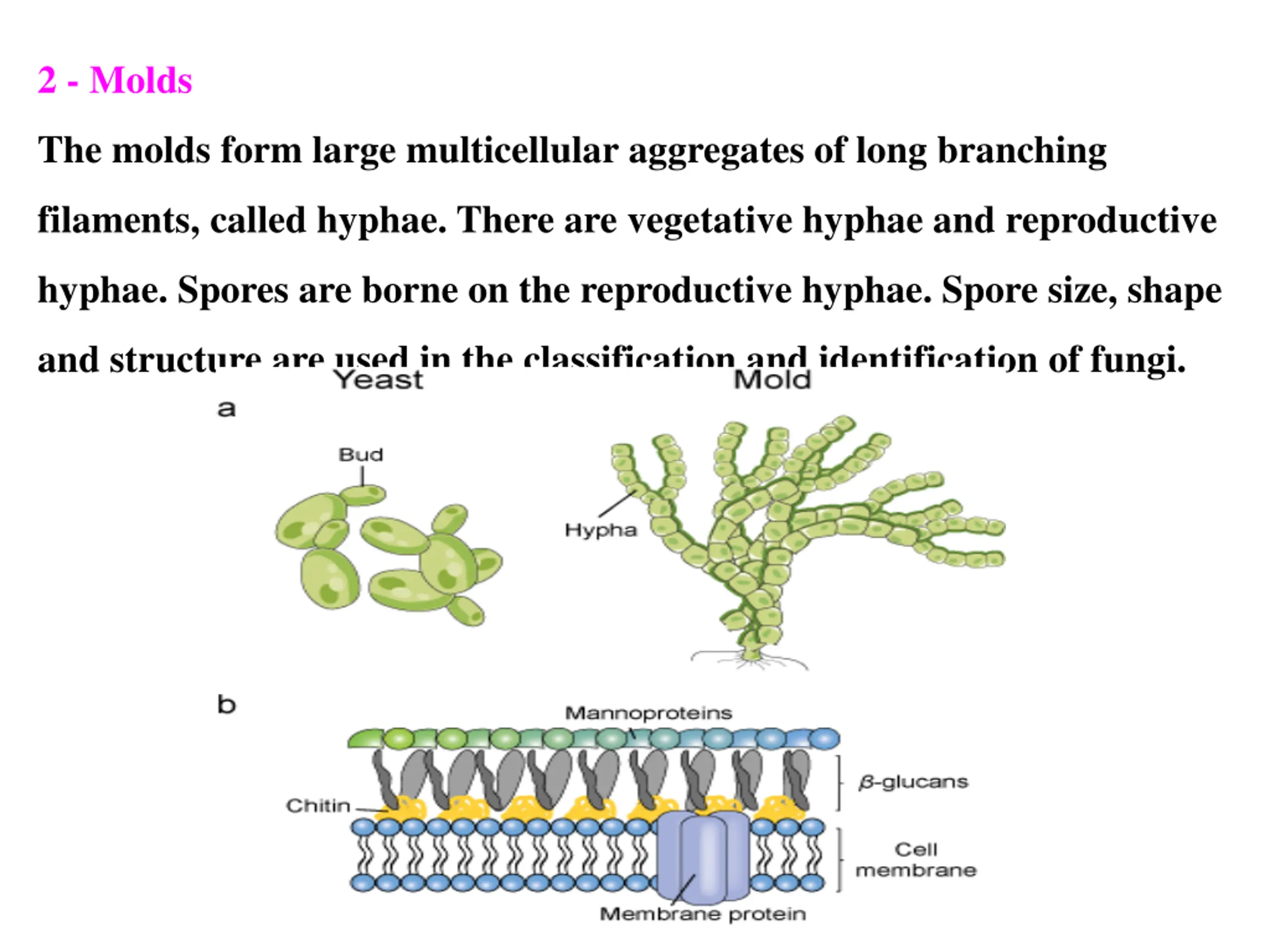 2 - Molds The molds form large multicellular aggregates of long branching filaments, called hyphae. There are vegetative hyphae and reproductive hyphae. Spores are borne on the reproductive hyphae. Spore size, shape and structure are used in the classification and identification of fungi.