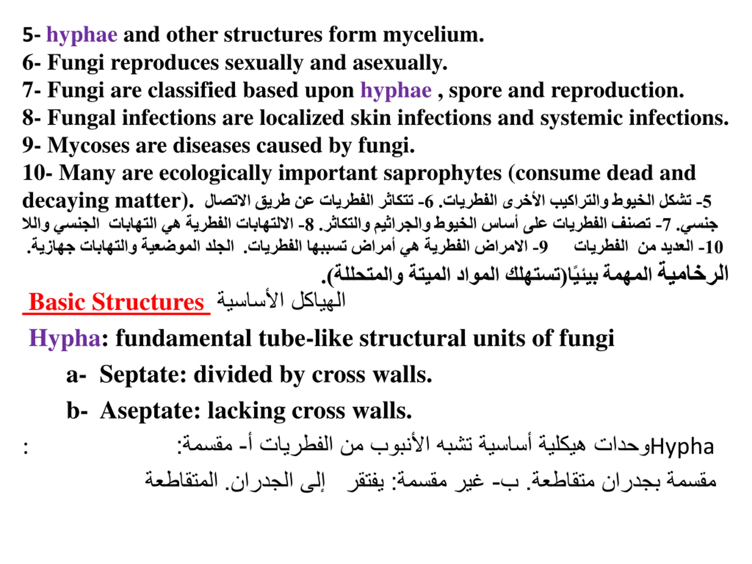 5- hyphae and other structures form mycelium. 6- Fungi reproduces sexually and asexually. 7- Fungi are classified based upon hyphae , spore and reproduction. 8- Fungal infections are localized skin infections and systemic infections. 9- Mycoses are diseases caused by fungi. 10- Many are ecologically important saprophytes (consume dead and decaying matter). . 8 - . . .) Basic Structures Hypha: fundamental tube-like structural units of fungi a- Septate: divided by cross walls. b- Aseptate: lacking cross walls. : - : . 6 - . 5 - 7 - . - 9 - 10 ( Hypha : - .