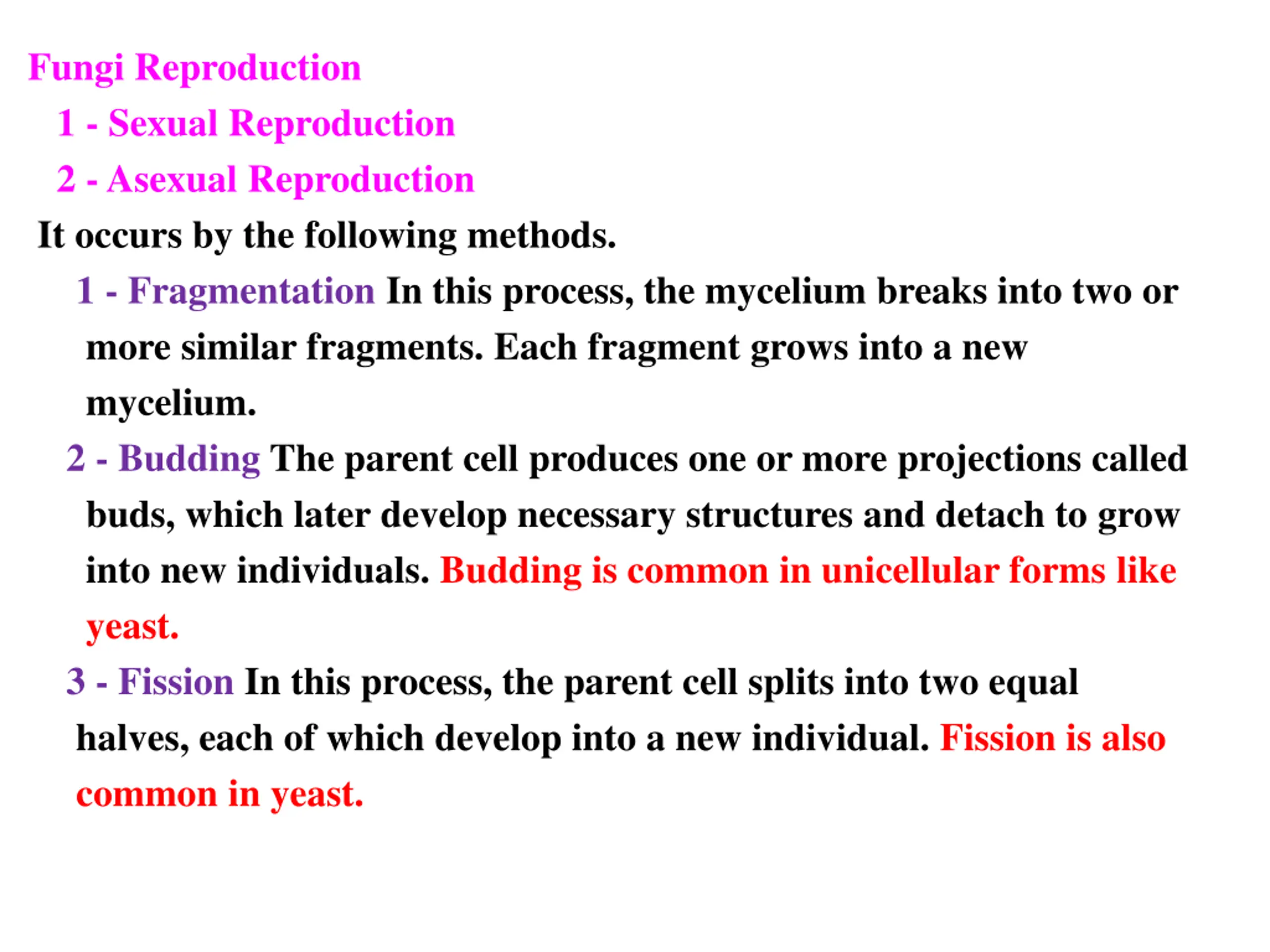 Fungi Reproduction 1 - Sexual Reproduction 2 -Asexual Reproduction It occurs by the following methods. 1 - Fragmentation In this process, the mycelium breaks into two or more similar fragments. Each fragment grows into a new mycelium. 2 - Budding The parent cell produces one or more projections called buds, which later develop necessary structures and detach to grow into new individuals. Budding is common in unicellular forms like yeast. 3 - Fission In this process, the parent cell splits into two equal halves, each of which develop into a new individual. Fission is also common in yeast.