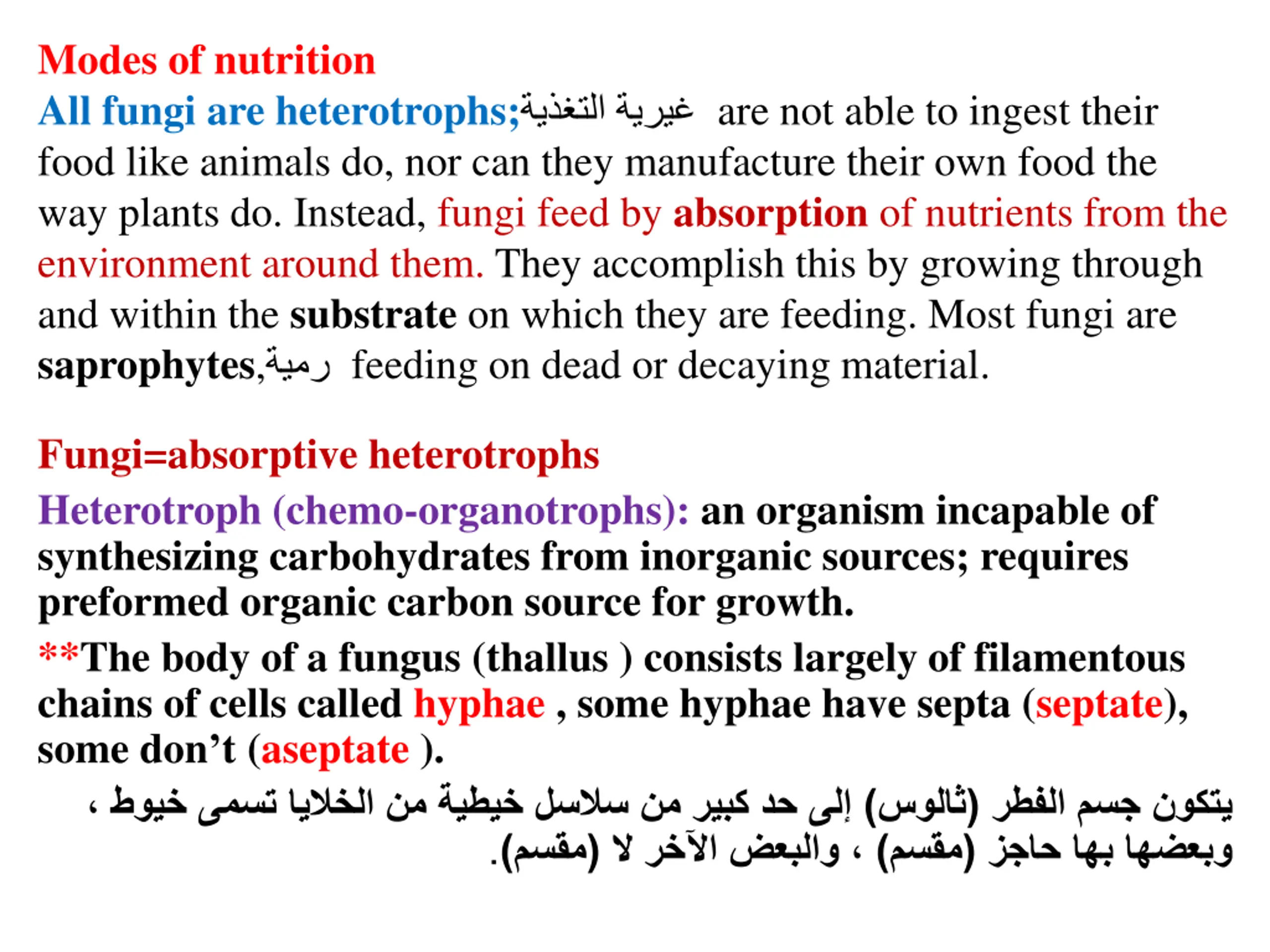 Modes of nutrition All fungi are heterotrophs; are not able to ingest their food like animals do, nor can they manufacture their own food the way plants do. Instead, fungi feed by absorption of nutrients from the environment around them. They accomplish this by growing through and within the substrate on which they are feeding. Most fungi are saprophytes, feeding on dead or decaying material. Fungi=absorptive heterotrophs Heterotroph (chemo-organotrophs): an organism incapable of synthesizing carbohydrates from inorganic sources; requires preformed organic carbon source for growth. **The body of a fungus (thallus ) consists largely of filamentous chains of cells called hyphae , some hyphae have septa (septate), some don t (aseptate ). ( ) . ) ) ( (