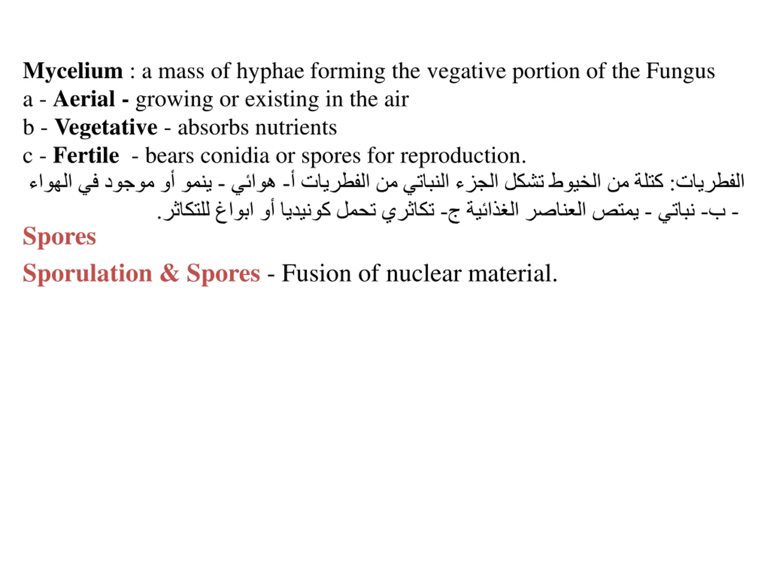 Mycelium : a mass of hyphae forming the vegative portion of the Fungus a - Aerial - growing or existing in the air b - Vegetative - absorbs nutrients c - Fertile - bears conidia or spores for reproduction. - - . Spores Sporulation & Spores - Fusion of nuclear material. - : - - -