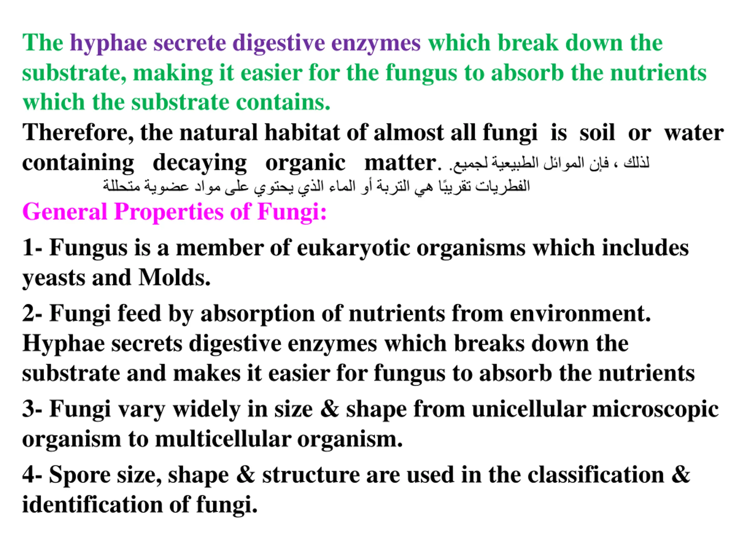 The hyphae secrete digestive enzymes which break down the substrate, making it easier for the fungus to absorb the nutrients which the substrate contains. Therefore, the natural habitat of almost all fungi is soil or water containing decaying organic matter. General Properties of Fungi: 1- Fungus is a member of eukaryotic organisms which includes yeasts and Molds. 2- Fungi feed by absorption of nutrients from environment. Hyphae secrets digestive enzymes which breaks down the substrate and makes it easier for fungus to absorb the nutrients 3- Fungi vary widely in size & shape from unicellular microscopic organism to multicellular organism. 4- Spore size, shape & structure are used in the classification & identification of fungi. .