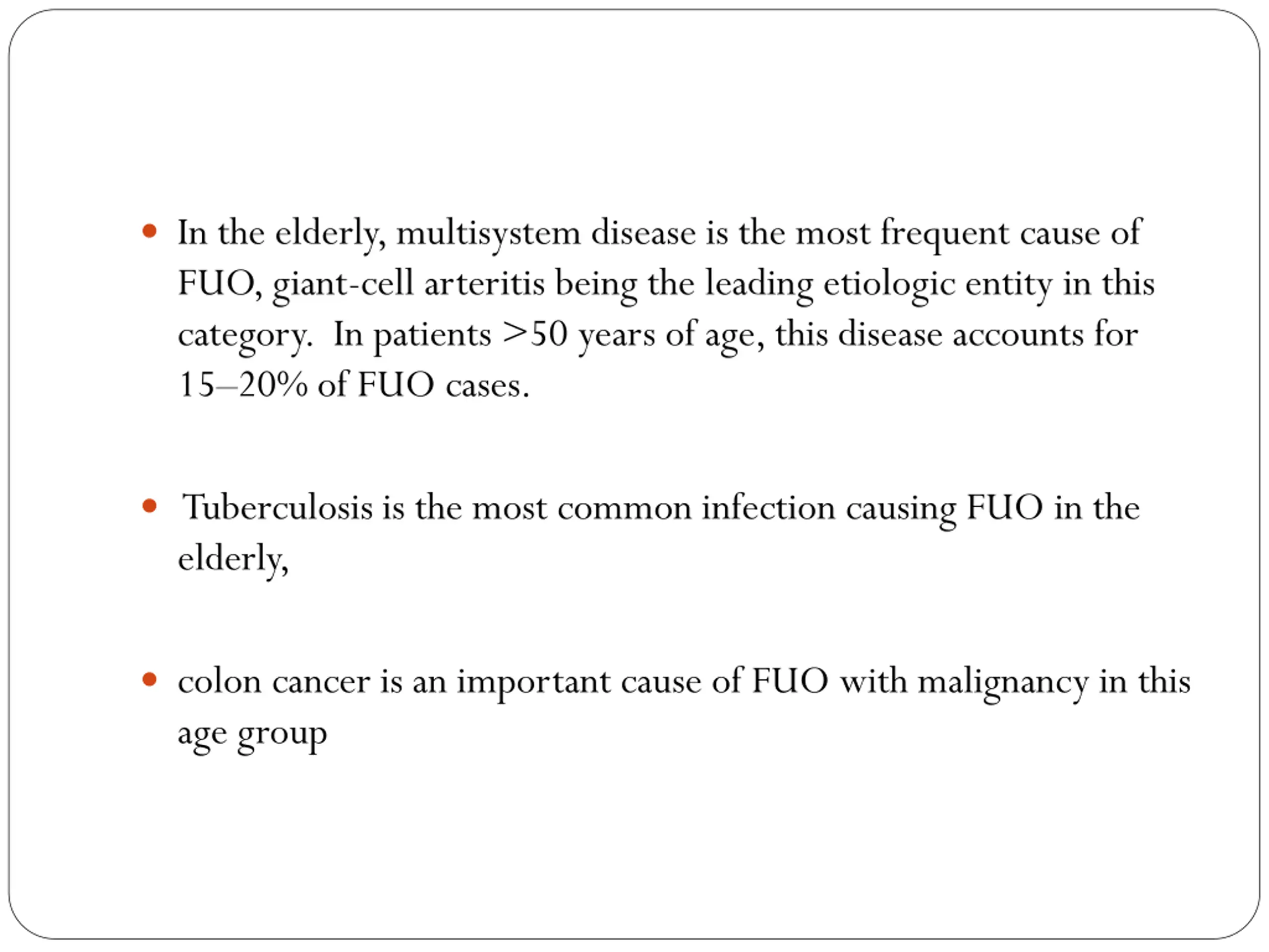 In the elderly, multisystem disease is the most frequent cause of FUO, giant-cell arteritis being the leading etiologic entity in this category. In patients >50 years of age, this disease accounts for 15 20% of FUO cases. Tuberculosis is the most common infection causing FUO in the elderly, colon cancer is an important cause of FUO with malignancy in this age group