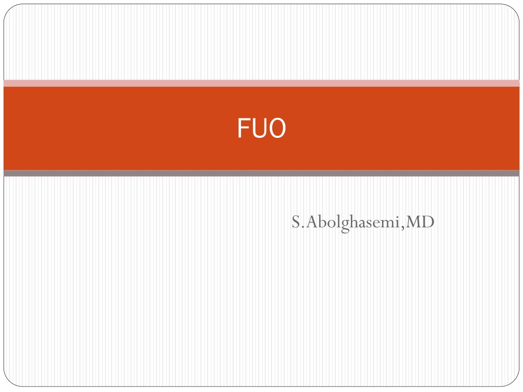 Fever of Unknown Origin (FUO) presents a diagnostic challenge in clinical practice. This article delves into classic presentations such as Neutropenic FUO, Nosocomial FUO, and HIV-associated FUO. It also explores various causes including infections, neoplasms, and inflammatory diseases. The elderly population, multisystem diseases, and giant-cell arteritis as common etiologies are discussed. With increasing fever duration, infectious causes decrease, highlighting the need for comprehensive investigation. Different categories of causes and their prevalence in cases lasting over six months are detailed.