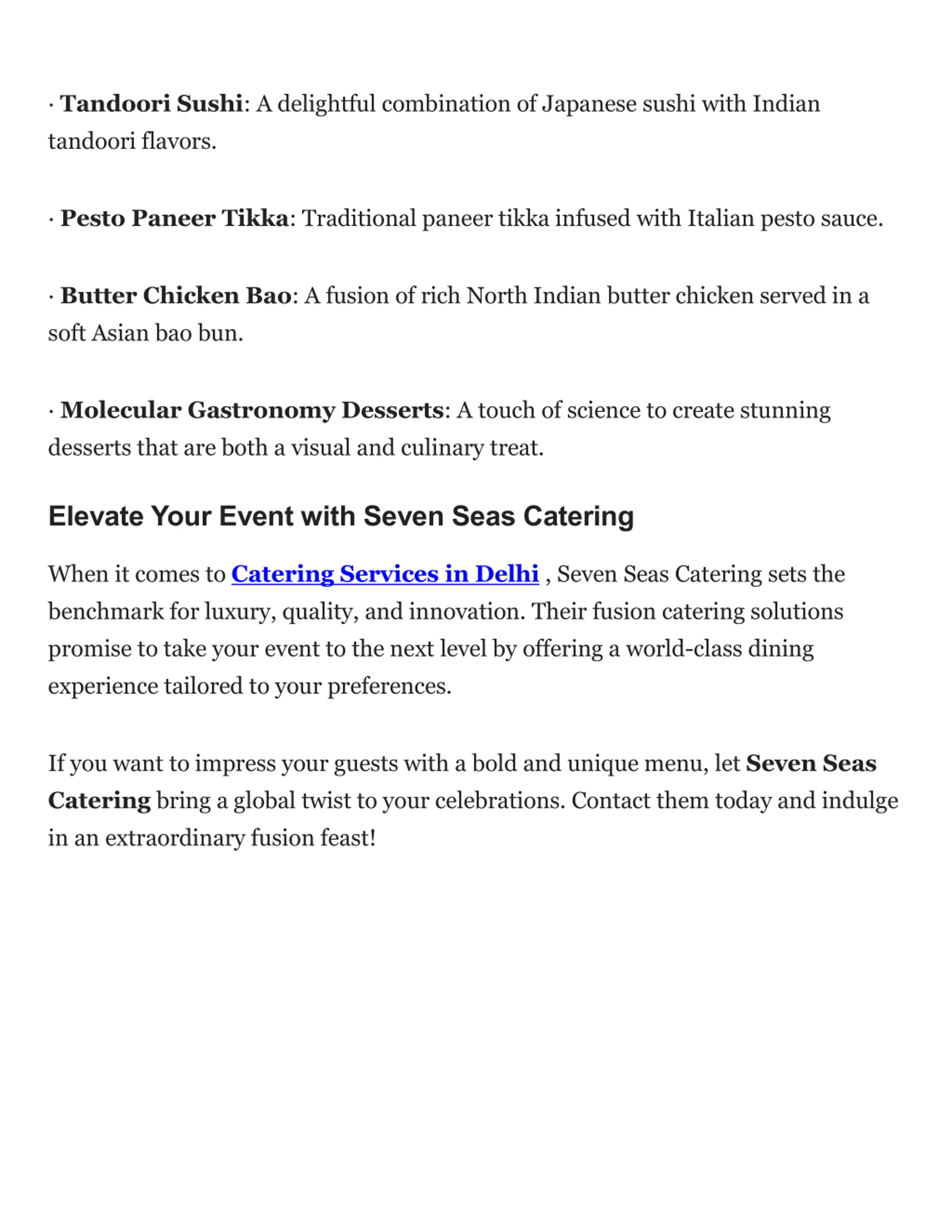 Tandoori Sushi: A delightful combination of Japanese sushi with Indian tandoori flavors. Pesto Paneer Tikka: Traditional paneer tikka infused with Italian pesto sauce. Butter Chicken Bao: A fusion of rich North Indian butter chicken served in a soft Asian bao bun. Molecular Gastronomy Desserts: A touch of science to create stunning desserts that are both a visual and culinary treat. Elevate Your Event with Seven Seas Catering When it comes to Catering Services in Delhi , Seven Seas Catering sets the benchmark for luxury, quality, and innovation. Their fusion catering solutions promise to take your event to the next level by offering a world-class dining experience tailored to your preferences. If you want to impress your guests with a bold and unique menu, let Seven Seas Catering bring a global twist to your celebrations. Contact them today and indulge in an extraordinary fusion feast!