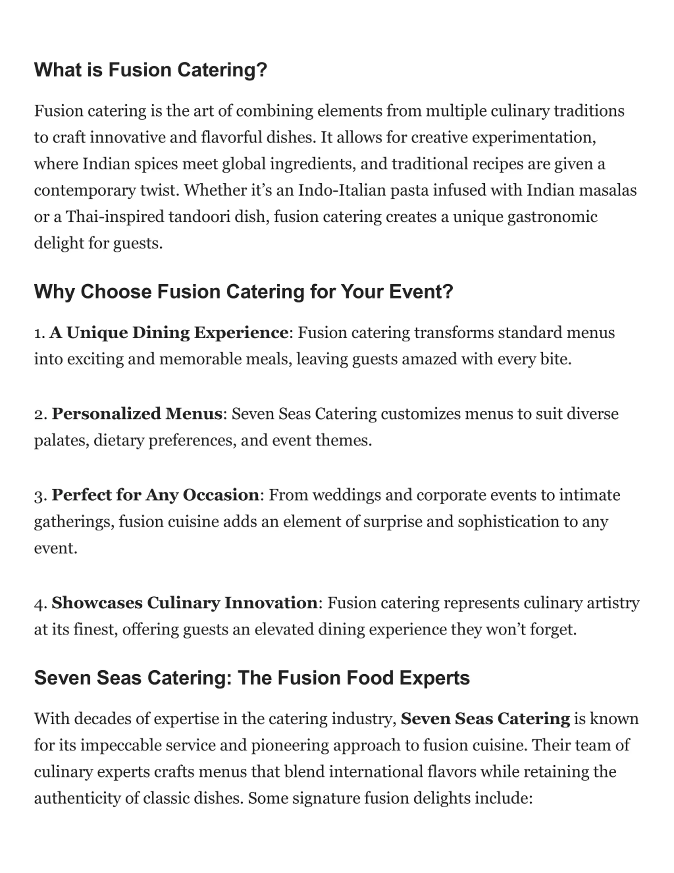 What is Fusion Catering? Fusion catering is the art of combining elements from multiple culinary traditions to craft innovative and flavorful dishes. It allows for creative experimentation, where Indian spices meet global ingredients, and traditional recipes are given a contemporary twist. Whether it s an Indo-Italian pasta infused with Indian masalas or a Thai-inspired tandoori dish, fusion catering creates a unique gastronomic delight for guests. Why Choose Fusion Catering for Your Event? 1. A Unique Dining Experience: Fusion catering transforms standard menus into exciting and memorable meals, leaving guests amazed with every bite. 2. Personalized Menus: Seven Seas Catering customizes menus to suit diverse palates, dietary preferences, and event themes. 3. Perfect for Any Occasion: From weddings and corporate events to intimate gatherings, fusion cuisine adds an element of surprise and sophistication to any event. 4. Showcases Culinary Innovation: Fusion catering represents culinary artistry at its finest, offering guests an elevated dining experience they won t forget. Seven Seas Catering: The Fusion Food Experts With decades of expertise in the catering industry, Seven Seas Catering is known for its impeccable service and pioneering approach to fusion cuisine. Their team of culinary experts crafts menus that blend international flavors while retaining the authenticity of classic dishes. Some signature fusion delights include: