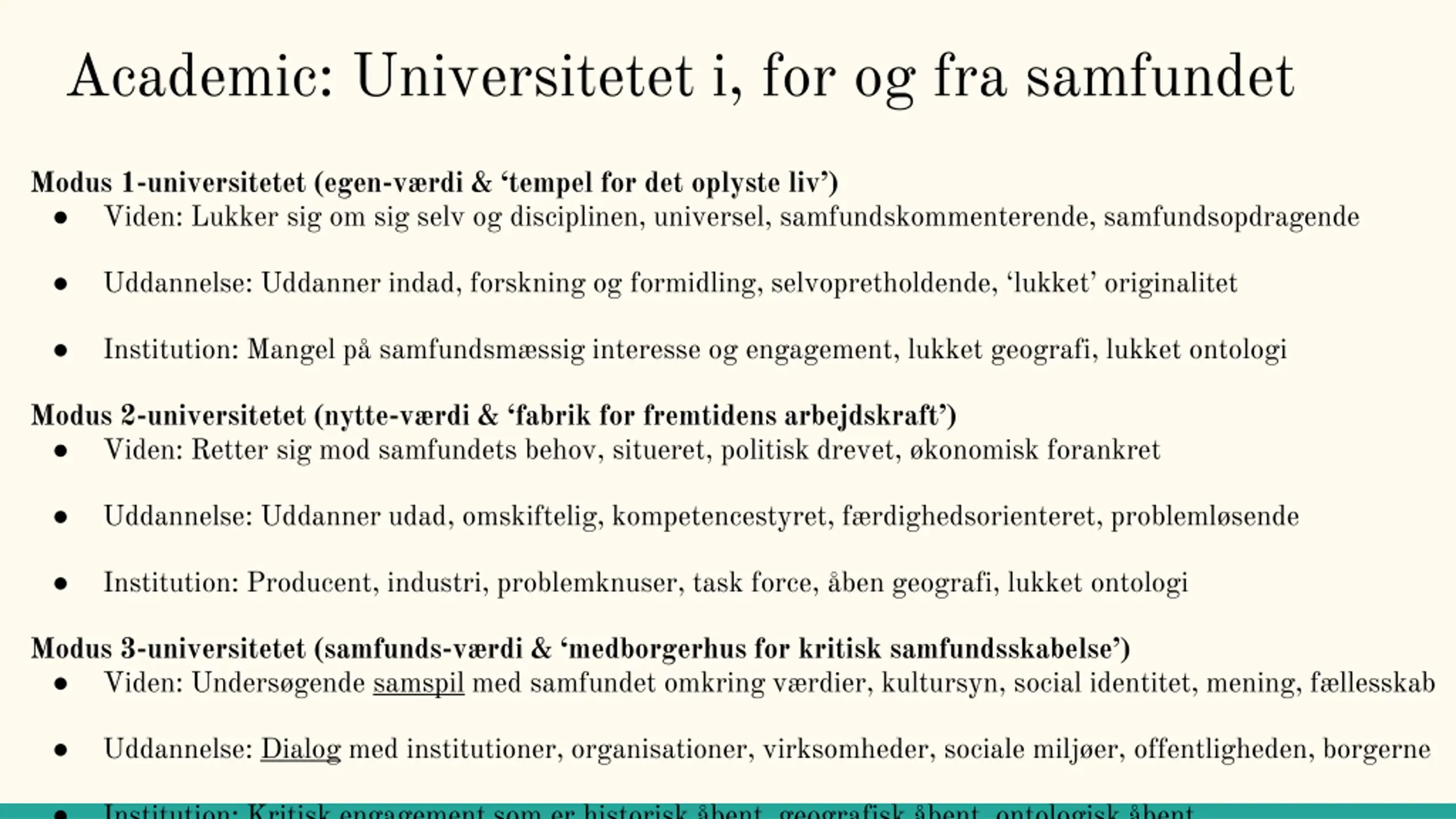 Academic: Universitetet i, for og fra samfundet Modus 1-universitetet (egen-v rdi & tempel for det oplyste liv ) Viden: Lukker sig om sig selv og disciplinen, universel, samfundskommenterende, samfundsopdragende Uddannelse: Uddanner indad, forskning og formidling, selvopretholdende, lukket originalitet Institution: Mangel p samfundsm ssig interesse og engagement, lukket geografi, lukket ontologi Modus 2-universitetet (nytte-v rdi & fabrik for fremtidens arbejdskraft ) Viden: Retter sig mod samfundets behov, situeret, politisk drevet, konomisk forankret Uddannelse: Uddanner udad, omskiftelig, kompetencestyret, f rdighedsorienteret, probleml sende Institution: Producent, industri, problemknuser, task force, ben geografi, lukket ontologi Modus 3-universitetet (samfunds-v rdi & medborgerhus for kritisk samfundsskabelse ) Viden: Unders gende samspil med samfundet omkring v rdier, kultursyn, social identitet, mening, f llesskab Uddannelse: Dialog med institutioner, organisationer, virksomheder, sociale milj er, offentligheden, borgerne Institution: Kritisk engagement som er historisk bent, geografisk bent, ontologisk bent