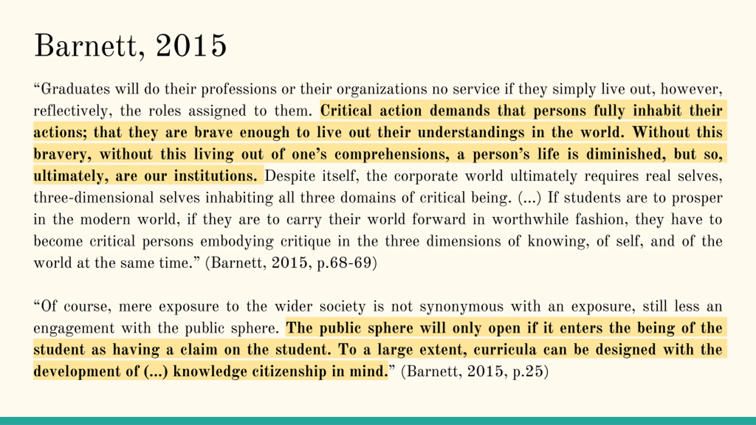 Barnett, 2015 Graduates will do their professions or their organizations no service if they simply live out, however, reflectively, the roles assigned to them. Critical action demands that persons fully inhabit their actions; that they are brave enough to live out their understandings in the world. Without this bravery, without this living out of one s comprehensions, a person s life is diminished, but so, ultimately, are our institutions. Despite itself, the corporate world ultimately requires real selves, three-dimensional selves inhabiting all three domains of critical being. ( ) If students are to prosper in the modern world, if they are to carry their world forward in worthwhile fashion, they have to become critical persons embodying critique in the three dimensions of knowing, of self, and of the world at the same time. (Barnett, 2015, p.68-69) Of course, mere exposure to the wider society is not synonymous with an exposure, still less an engagement with the public sphere. The public sphere will only open if it enters the being of the student as having a claim on the student. To a large extent, curricula can be designed with the development of (...) knowledge citizenship in mind. (Barnett, 2015, p.25)