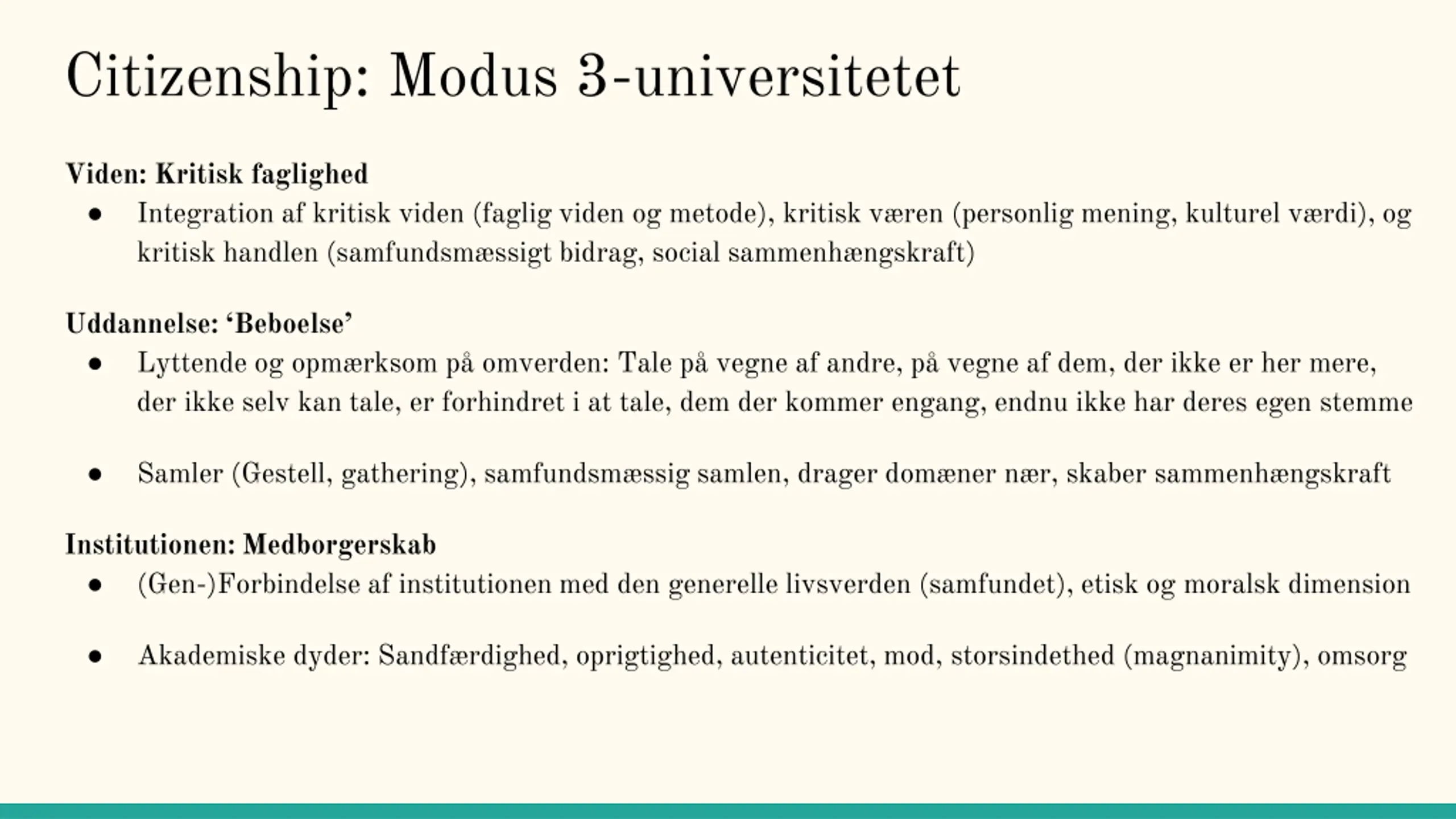 Citizenship: Modus 3-universitetet Viden: Kritisk faglighed Integration af kritisk viden (faglig viden og metode), kritisk v ren (personlig mening, kulturel v rdi), og kritisk handlen (samfundsm ssigt bidrag, social sammenh ngskraft) Uddannelse: Beboelse Lyttende og opm rksom p omverden: Tale p vegne af andre, p vegne af dem, der ikke er her mere, der ikke selv kan tale, er forhindret i at tale, dem der kommer engang, endnu ikke har deres egen stemme Samler (Gestell, gathering), samfundsm ssig samlen, drager dom ner n r, skaber sammenh ngskraft Institutionen: Medborgerskab (Gen-)Forbindelse af institutionen med den generelle livsverden (samfundet), etisk og moralsk dimension Akademiske dyder: Sandf rdighed, oprigtighed, autenticitet, mod, storsindethed (magnanimity), omsorg