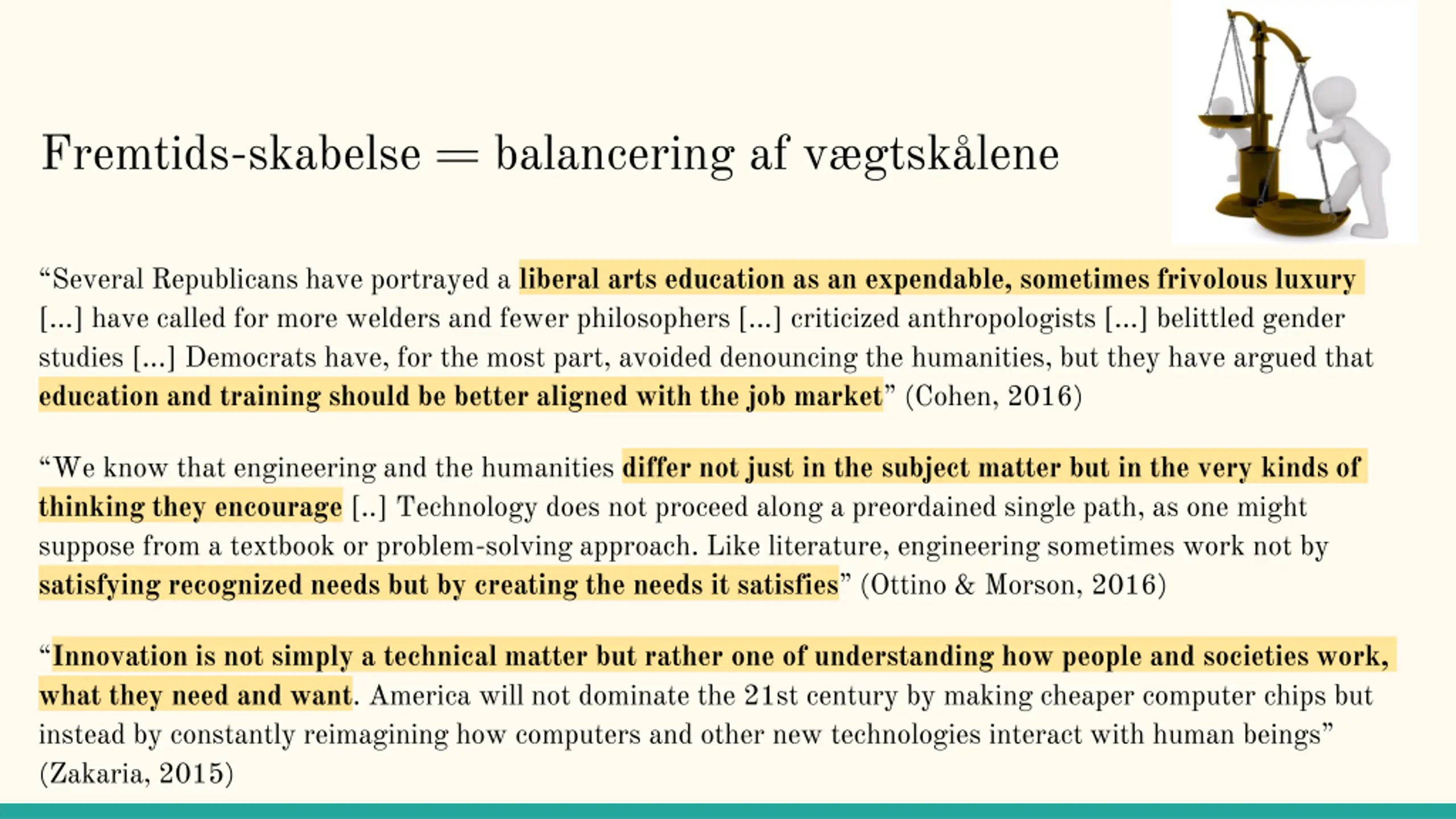 Fremtids-skabelse = balancering af vgtsklene Several Republicans have portrayed a liberal arts education as an expendable, sometimes frivolous luxury [...] have called for more welders and fewer philosophers [...] criticized anthropologists [...] belittled gender studies [...] Democrats have, for the most part, avoided denouncing the humanities, but they have argued that education and training should be better aligned with the job market (Cohen, 2016) We know that engineering and the humanities differ not just in the subject matter but in the very kinds of thinking they encourage [..] Technology does not proceed along a preordained single path, as one might suppose from a textbook or problem-solving approach. Like literature, engineering sometimes work not by satisfying recognized needs but by creating the needs it satisfies (Ottino & Morson, 2016) Innovation is not simply a technical matter but rather one of understanding how people and societies work, what they need and want. America will not dominate the 21st century by making cheaper computer chips but instead by constantly reimagining how computers and other new technologies interact with human beings (Zakaria, 2015)