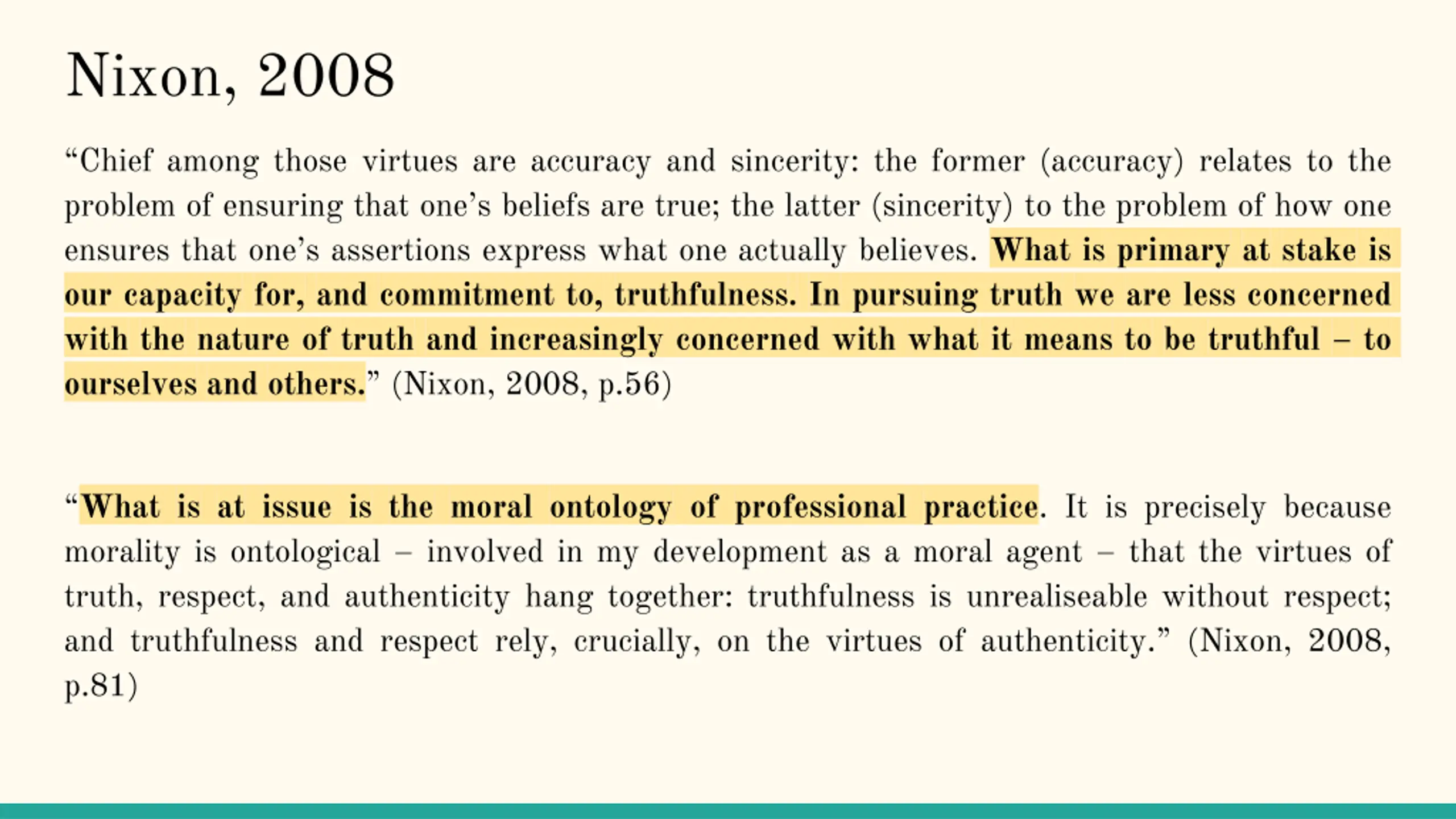 Nixon, 2008 Chief among those virtues are accuracy and sincerity: the former (accuracy) relates to the problem of ensuring that one s beliefs are true; the latter (sincerity) to the problem of how one ensures that one s assertions express what one actually believes. What is primary at stake is our capacity for, and commitment to, truthfulness. In pursuing truth we are less concerned with the nature of truth and increasingly concerned with what it means to be truthful to ourselves and others. (Nixon, 2008, p.56) What is at issue is the moral ontology of professional practice. It is precisely because morality is ontological involved in my development as a moral agent that the virtues of truth, respect, and authenticity hang together: truthfulness is unrealiseable without respect; and truthfulness and respect rely, crucially, on the virtues of authenticity. (Nixon, 2008, p.81)