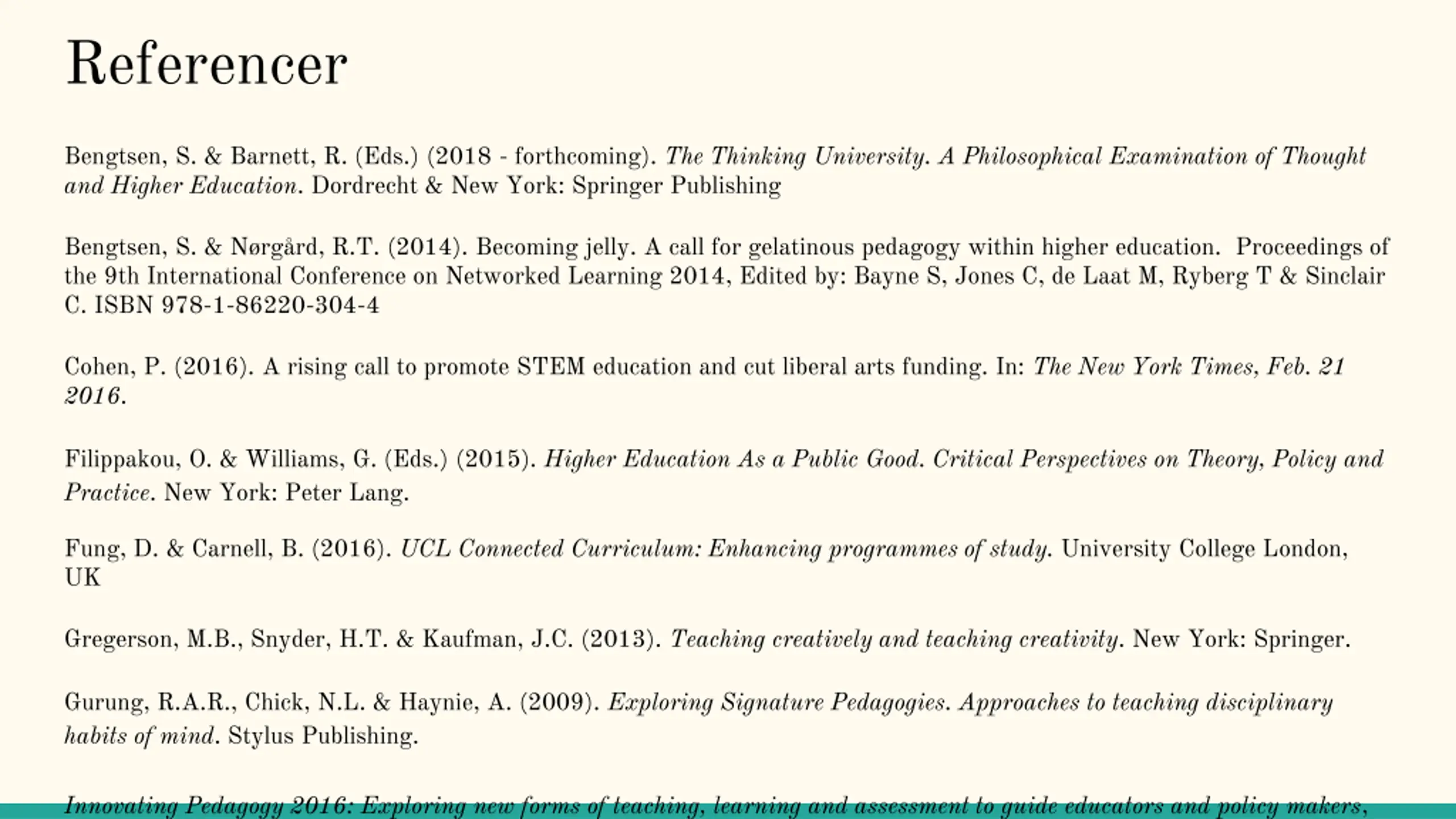 Referencer Bengtsen, S. & Barnett, R. (Eds.) (2018 - forthcoming). The Thinking University. A Philosophical Examination of Thought and Higher Education. Dordrecht & New York: Springer Publishing Bengtsen, S. & N rg rd, R.T. (2014). Becoming jelly. A call for gelatinous pedagogy within higher education. Proceedings of the 9th International Conference on Networked Learning 2014, Edited by: Bayne S, Jones C, de Laat M, Ryberg T & Sinclair C. ISBN 978-1-86220-304-4 Cohen, P. (2016). A rising call to promote STEM education and cut liberal arts funding. In: The New York Times, Feb. 21 2016. Filippakou, O. & Williams, G. (Eds.) (2015). Higher Education As a Public Good. Critical Perspectives on Theory, Policy and Practice. New York: Peter Lang. Fung, D. & Carnell, B. (2016). UCL Connected Curriculum: Enhancing programmes of study. University College London, UK Gregerson, M.B., Snyder, H.T. & Kaufman, J.C. (2013). Teaching creatively and teaching creativity. New York: Springer. Gurung, R.A.R., Chick, N.L. & Haynie, A. (2009). Exploring Signature Pedagogies. Approaches to teaching disciplinary habits of mind. Stylus Publishing. Innovating Pedagogy 2016: Exploring new forms of teaching, learning and assessment to guide educators and policy makers,