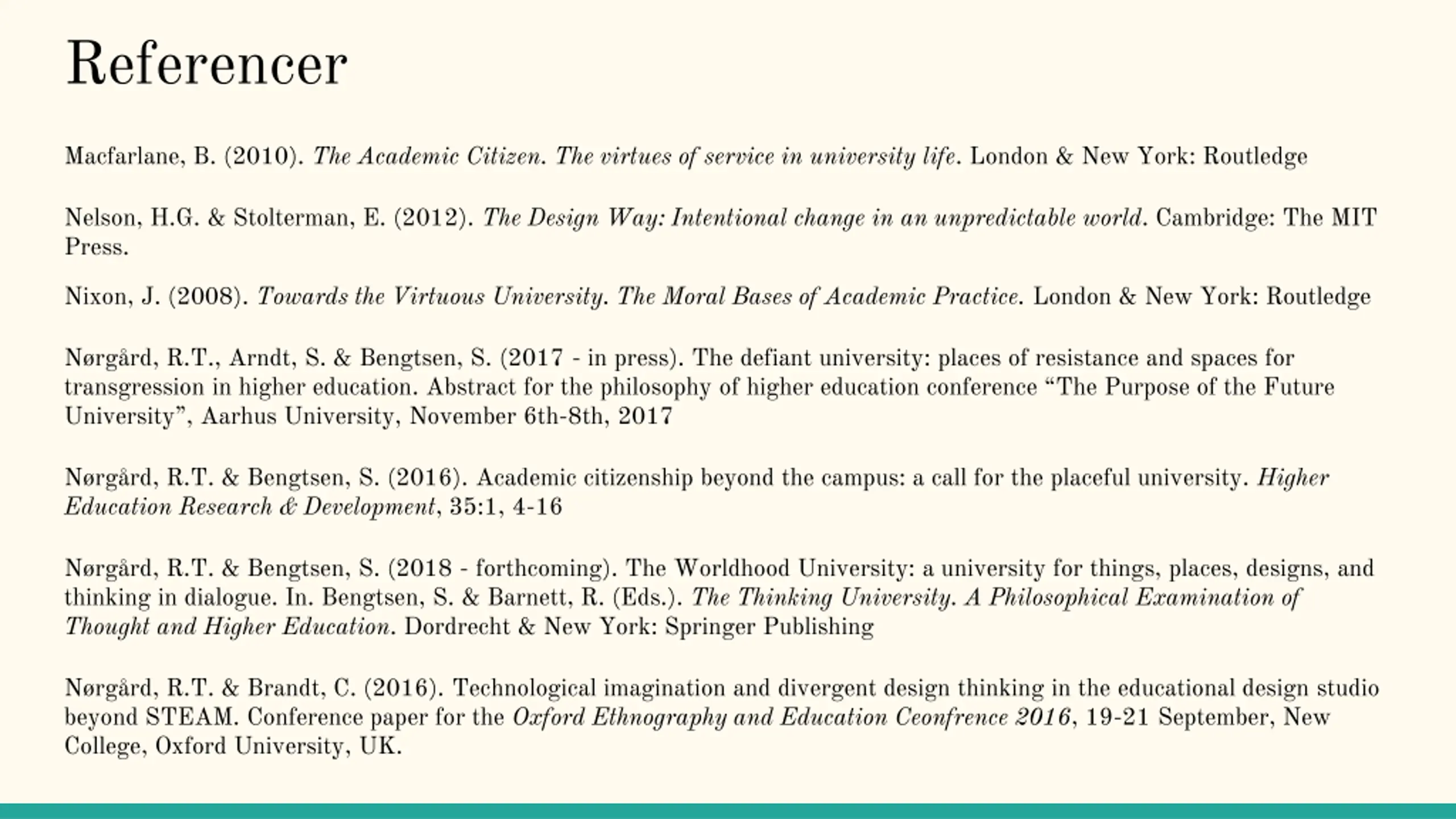 Referencer Macfarlane, B. (2010). The Academic Citizen. The virtues of service in university life. London & New York: Routledge Nelson, H.G. & Stolterman, E. (2012). The Design Way: Intentional change in an unpredictable world. Cambridge: The MIT Press. Nixon, J. (2008). Towards the Virtuous University. The Moral Bases of Academic Practice. London & New York: Routledge N rg rd, R.T., Arndt, S. & Bengtsen, S. (2017 - in press). The defiant university: places of resistance and spaces for transgression in higher education. Abstract for the philosophy of higher education conference The Purpose of the Future University , Aarhus University, November 6th-8th, 2017 N rg rd, R.T. & Bengtsen, S. (2016). Academic citizenship beyond the campus: a call for the placeful university. Higher Education Research & Development, 35:1, 4-16 N rg rd, R.T. & Bengtsen, S. (2018 - forthcoming). The Worldhood University: a university for things, places, designs, and thinking in dialogue. In. Bengtsen, S. & Barnett, R. (Eds.). The Thinking University. A Philosophical Examination of Thought and Higher Education. Dordrecht & New York: Springer Publishing N rg rd, R.T. & Brandt, C. (2016). Technological imagination and divergent design thinking in the educational design studio beyond STEAM. Conference paper for the Oxford Ethnography and Education Ceonfrence 2016, 19-21 September, New College, Oxford University, UK.