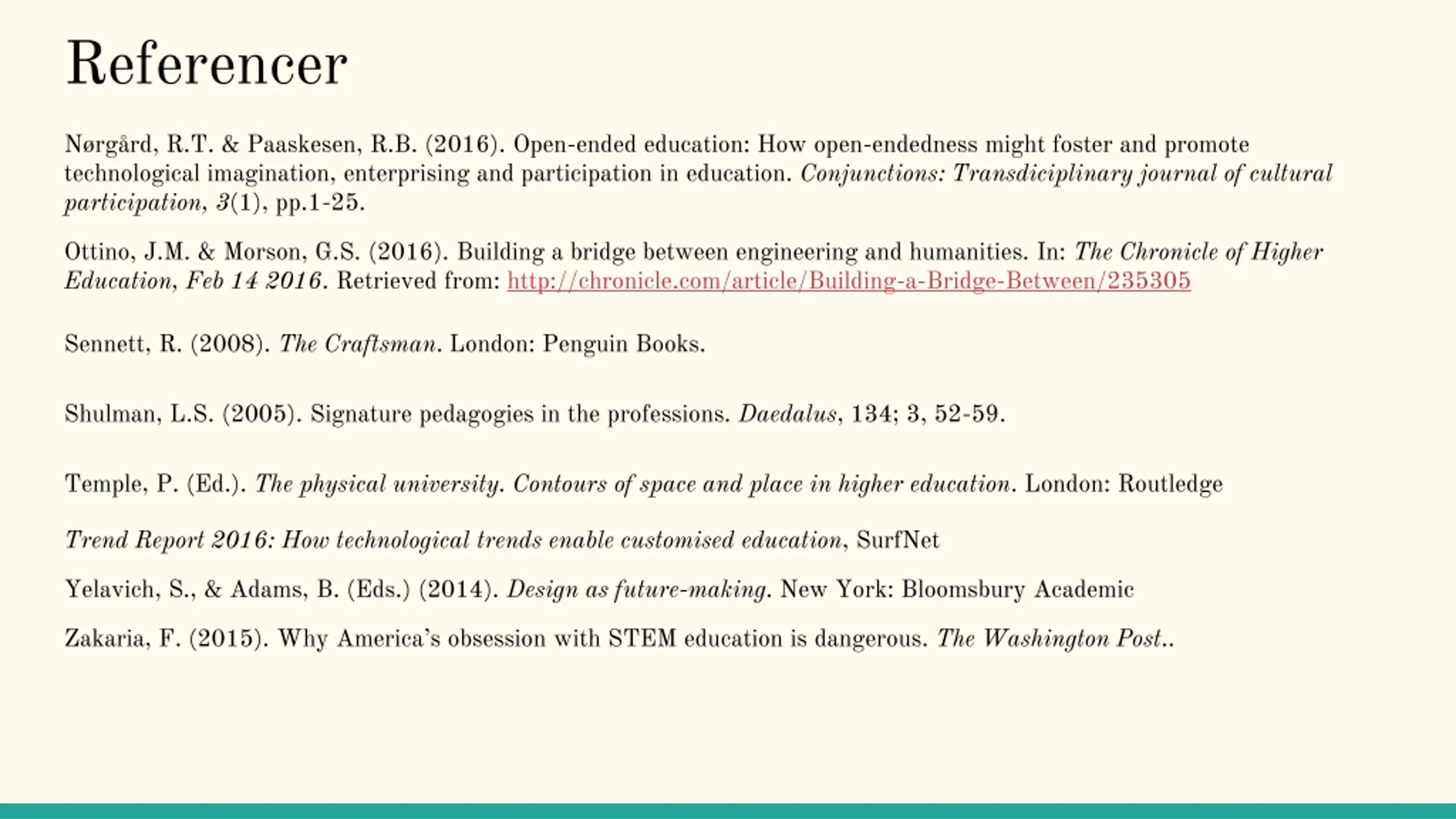 Referencer N rg rd, R.T. & Paaskesen, R.B. (2016). Open-ended education: How open-endedness might foster and promote technological imagination, enterprising and participation in education. Conjunctions: Transdiciplinary journal of cultural participation, 3(1), pp.1-25. Ottino, J.M. & Morson, G.S. (2016). Building a bridge between engineering and humanities. In: The Chronicle of Higher Education, Feb 14 2016. Retrieved from: http://chronicle.com/article/Building-a-Bridge-Between/235305 Sennett, R. (2008). The Craftsman. London: Penguin Books. Shulman, L.S. (2005). Signature pedagogies in the professions. Daedalus, 134; 3, 52-59. Temple, P. (Ed.). The physical university. Contours of space and place in higher education. London: Routledge Trend Report 2016: How technological trends enable customised education, SurfNet Yelavich, S., & Adams, B. (Eds.) (2014). Design as future-making. New York: Bloomsbury Academic Zakaria, F. (2015). Why America s obsession with STEM education is dangerous. The Washington Post..