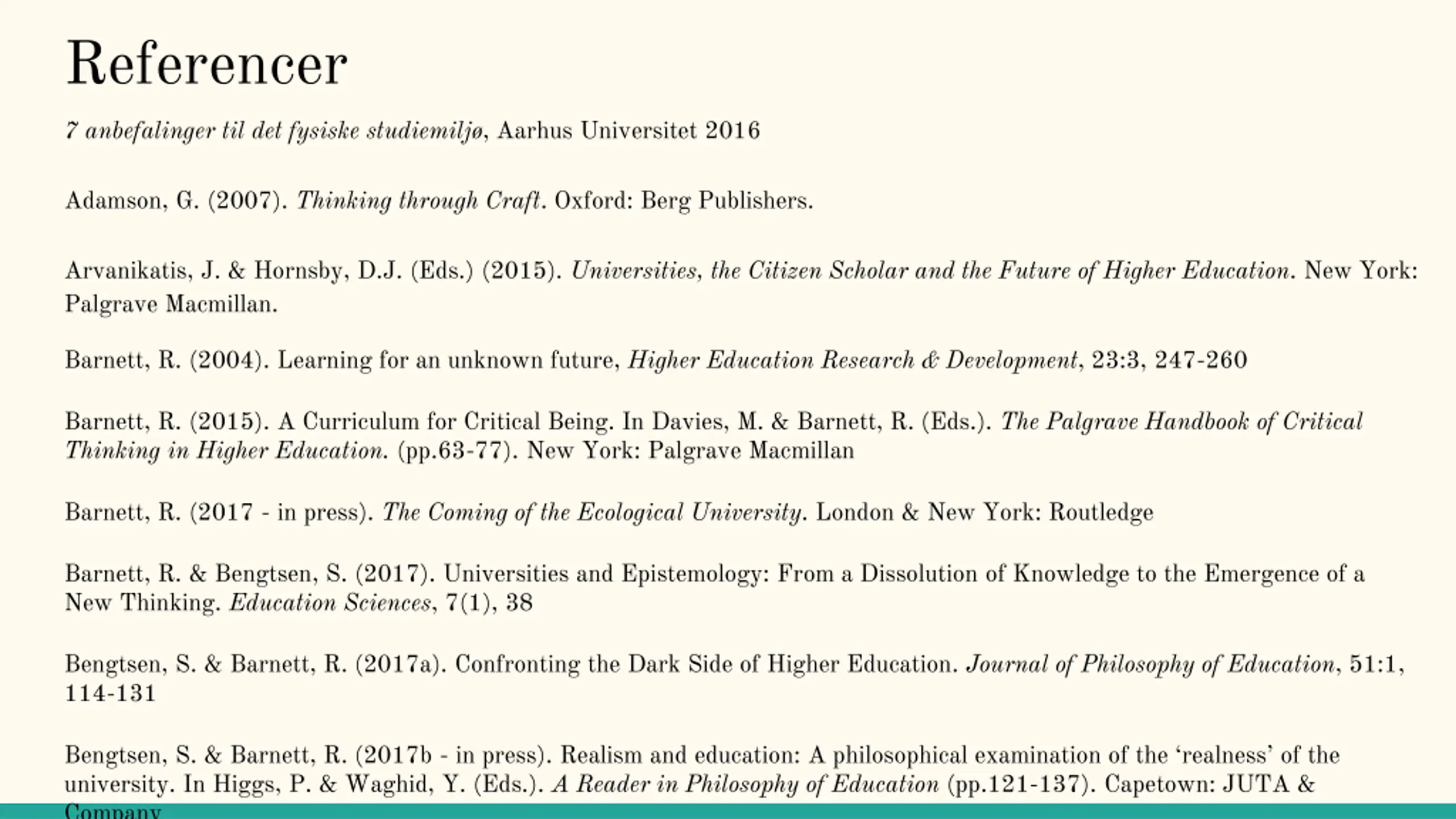 Referencer 7 anbefalinger til det fysiske studiemilj , Aarhus Universitet 2016 Adamson, G. (2007). Thinking through Craft. Oxford: Berg Publishers. Arvanikatis, J. & Hornsby, D.J. (Eds.) (2015). Universities, the Citizen Scholar and the Future of Higher Education. New York: Palgrave Macmillan. Barnett, R. (2004). Learning for an unknown future, Higher Education Research & Development, 23:3, 247-260 Barnett, R. (2015). A Curriculum for Critical Being. In Davies, M. & Barnett, R. (Eds.). The Palgrave Handbook of Critical Thinking in Higher Education. (pp.63-77). New York: Palgrave Macmillan Barnett, R. (2017 - in press). The Coming of the Ecological University. London & New York: Routledge Barnett, R. & Bengtsen, S. (2017). Universities and Epistemology: From a Dissolution of Knowledge to the Emergence of a New Thinking. Education Sciences, 7(1), 38 Bengtsen, S. & Barnett, R. (2017a). Confronting the Dark Side of Higher Education. Journal of Philosophy of Education, 51:1, 114-131 Bengtsen, S. & Barnett, R. (2017b - in press). Realism and education: A philosophical examination of the realness of the university. In Higgs, P. & Waghid, Y. (Eds.). A Reader in Philosophy of Education (pp.121-137). Capetown: JUTA & Company