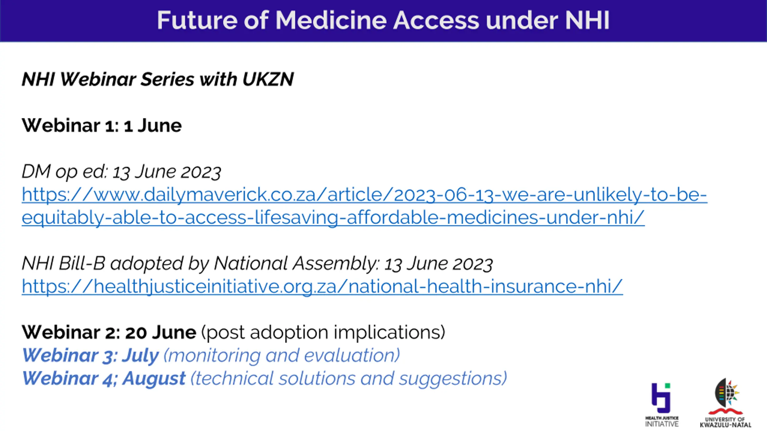 Future of Medicine Access under NHI NHI Webinar Series with UKZN Webinar 1: 1 June DM op ed: 13 June 2023 https://www.dailymaverick.co.za/article/2023-06-13-we-are-unlikely-to-be- equitably-able-to-access-lifesaving-affordable-medicines-under-nhi/ NHI Bill-B adopted by National Assembly: 13 June 2023 https://healthjusticeinitiative.org.za/national-health-insurance-nhi/ Webinar 2: 20 June (post adoption implications) Webinar 3: July (monitoring and evaluation) Webinar 4; August (technical solutions and suggestions)