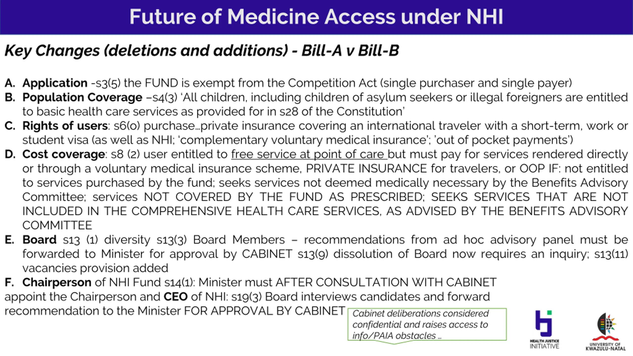 Future of Medicine Access under NHI Key Changes (deletions and additions) - Bill-A v Bill-B A. Application -s3(5) the FUND is exempt from the Competition Act (single purchaser and single payer) B. Population Coverage s4(3) All children, including children of asylum seekers or illegal foreigners are entitled to basic health care services as provided for in s28 of the Constitution C. Rights of users: s6(o) purchase private insurance covering an international traveler with a short-term, work or student visa (as well as NHI; complementary voluntary medical insurance ; out of pocket payments ) D. Cost coverage: s8 (2) user entitled to free service at point of care but must pay for services rendered directly or through a voluntary medical insurance scheme, PRIVATE INSURANCE for travelers, or OOP IF: not entitled to services purchased by the fund; seeks services not deemed medically necessary by the Benefits Advisory Committee; services NOT COVERED BY THE FUND AS PRESCRIBED; SEEKS SERVICES THAT ARE NOT INCLUDED IN THE COMPREHENSIVE HEALTH CARE SERVICES, AS ADVISED BY THE BENEFITS ADVISORY COMMITTEE E. Board s13 (1) diversity s13(3) Board Members recommendations from ad hoc advisory panel must be forwarded to Minister for approval by CABINET s13(9) dissolution of Board now requires an inquiry; s13(11) vacancies provision added F. Chairperson of NHI Fund s14(1): Minister must AFTER CONSULTATION WITH CABINET appoint the Chairperson and CEO of NHI: s19(3) Board interviews candidates and forward recommendation to the Minister FOR APPROVAL BY CABINET Cabinet deliberations considered confidential and raises access to info/PAIA obstacles