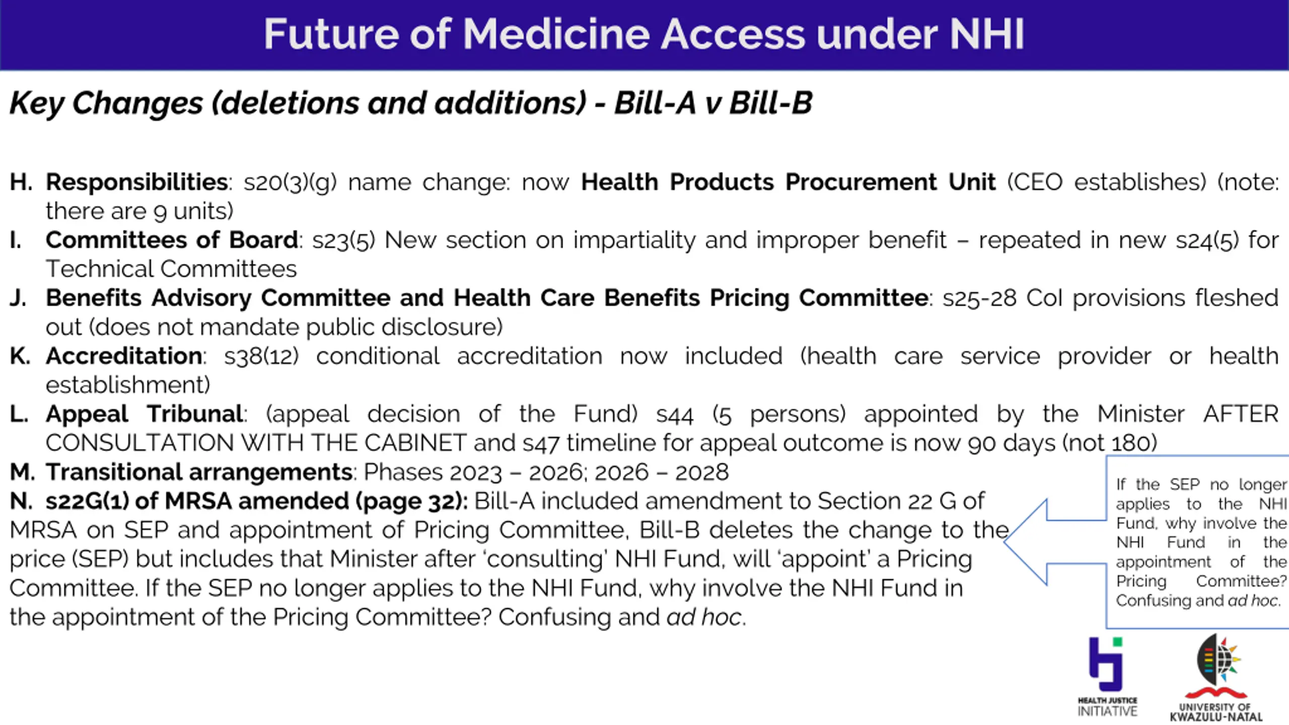 Future of Medicine Access under NHI Key Changes (deletions and additions) - Bill-A v Bill-B H. Responsibilities: s20(3)(g) name change: now Health Products Procurement Unit (CEO establishes) (note: there are 9 units) I. Committees of Board: s23(5) New section on impartiality and improper benefit repeated in new s24(5) for Technical Committees J. Benefits Advisory Committee and Health Care Benefits Pricing Committee: s25-28 CoI provisions fleshed out (does not mandate public disclosure) K. Accreditation: s38(12) conditional accreditation now included (health care service provider or health establishment) L. Appeal Tribunal: (appeal decision of the Fund) s44 (5 persons) appointed by the Minister AFTER CONSULTATION WITH THE CABINET and s47 timeline for appeal outcome is now 90 days (not 180) M. Transitional arrangements: Phases 2023 2026; 2026 2028 N. s22G(1) of MRSA amended (page 32): Bill-A included amendment to Section 22 G of MRSA on SEP and appointment of Pricing Committee, Bill-B deletes the change to the definition of single exit price (SEP) but includes that Minister after consulting NHI Fund, will appoint a Pricing Committee. If the SEP no longer applies to the NHI Fund, why involve the NHI Fund in the appointment of the Pricing Committee? Confusing and ad hoc. If the SEP no longer applies to the NHI Fund, why involve the NHI Fund appointment of the Pricing Committee? Confusing and ad hoc. in the