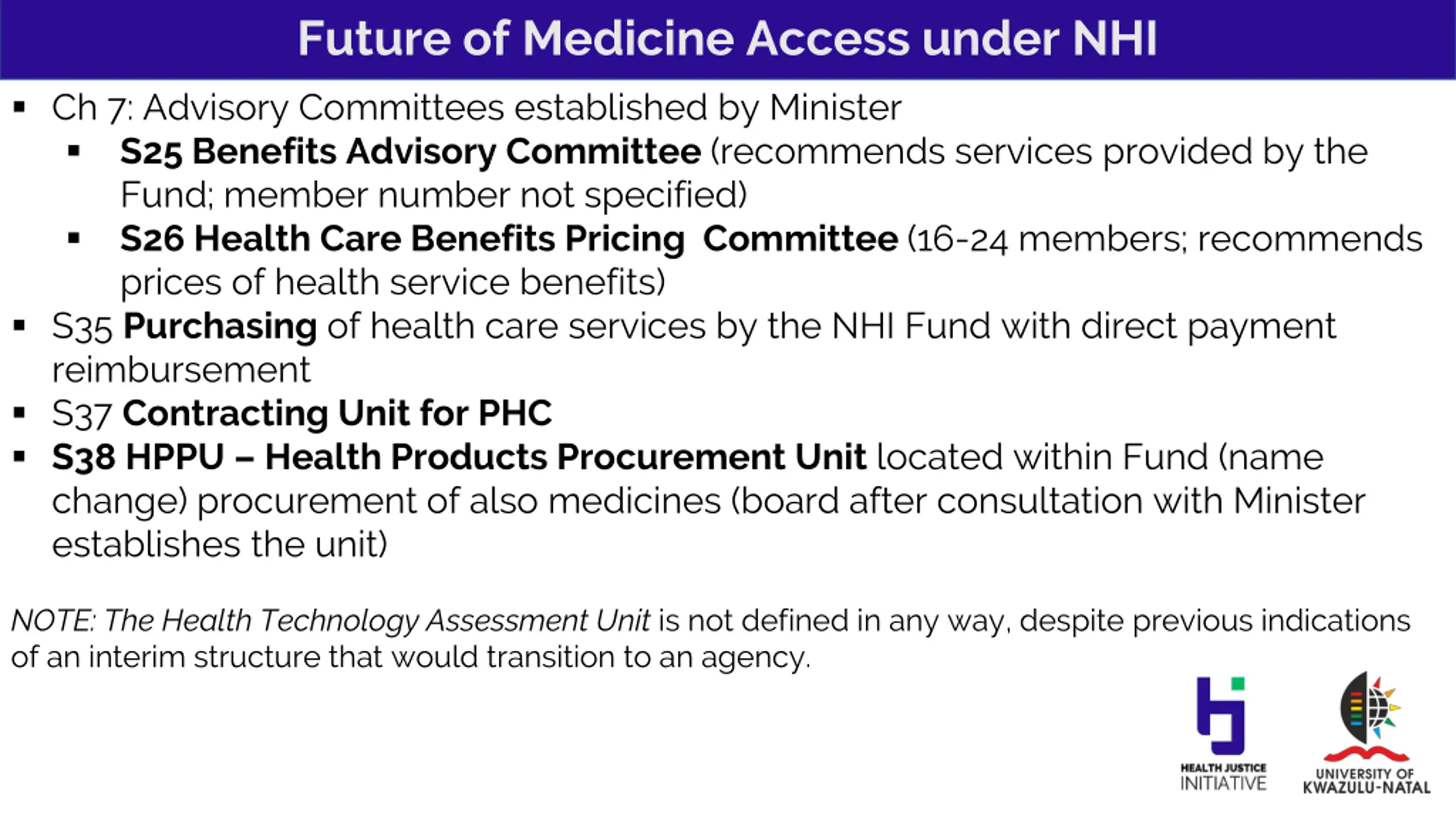 Future of Medicine Access under NHI Ch 7: Advisory Committees established by Minister S25 Benefits Advisory Committee (recommends services provided by the Fund; member number not specified) S26 Health Care Benefits Pricing Committee (16-24 members; recommends prices of health service benefits) S35 Purchasing of health care services by the NHI Fund with direct payment reimbursement S37 Contracting Unit for PHC S38 HPPU Health Products Procurement Unit located within Fund (name change) procurement of also medicines (board after consultation with Minister establishes the unit) NOTE: The Health Technology Assessment Unit is not defined in any way, despite previous indications of an interim structure that would transition to an agency.