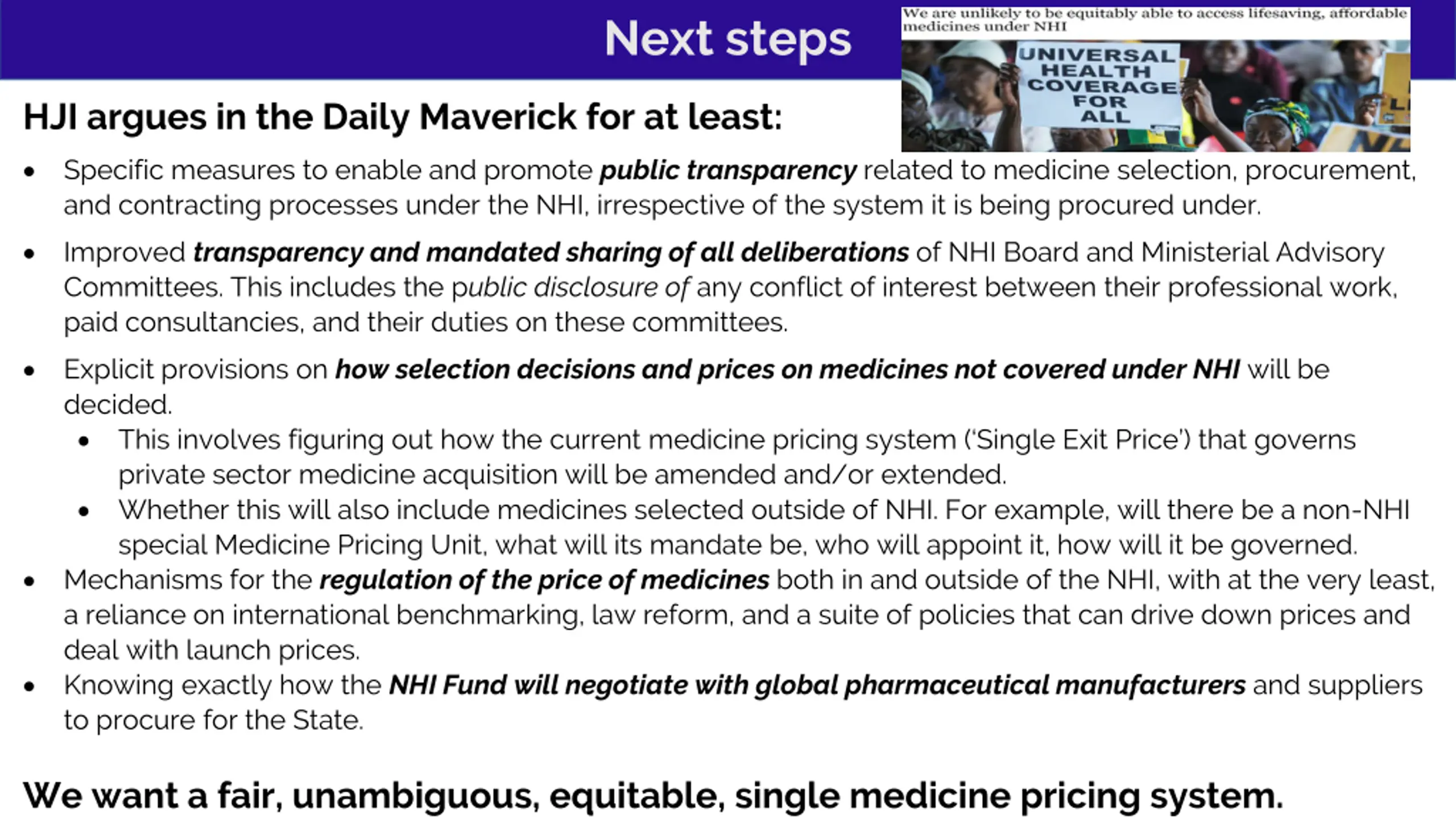 Next steps HJI argues in the Daily Maverick for at least: Specific measures to enable and promote public transparency related to medicine selection, procurement, and contracting processes under the NHI, irrespective of the system it is being procured under. Improved transparency and mandated sharing of all deliberations of NHI Board and Ministerial Advisory Committees. This includes the public disclosure of any conflict of interest between their professional work, paid consultancies, and their duties on these committees. Explicit provisions on how selection decisions and prices on medicines not covered under NHI will be decided. This involves figuring out how the current medicine pricing system ( Single Exit Price ) that governs private sector medicine acquisition will be amended and/or extended. Whether this will also include medicines selected outside of NHI. For example, will there be a non-NHI special Medicine Pricing Unit, what will its mandate be, who will appoint it, how will it be governed. Mechanisms for the regulation of the price of medicines both in and outside of the NHI, with at the very least, a reliance on international benchmarking, law reform, and a suite of policies that can drive down prices and deal with launch prices. Knowing exactly how the NHI Fund will negotiate with global pharmaceutical manufacturers and suppliers to procure for the State. We want a fair, unambiguous, equitable, single medicine pricing system.
