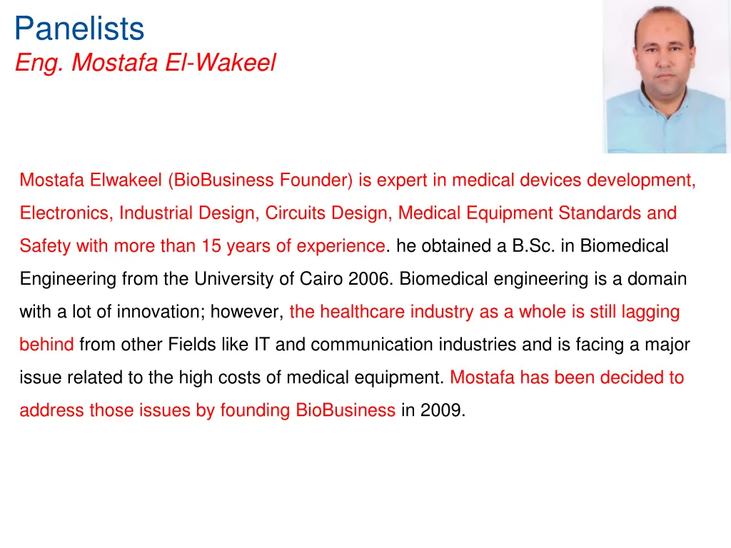 Panelists Eng. Mostafa El-Wakeel Mostafa Elwakeel (BioBusiness Founder) is expert in medical devices development, Electronics, Industrial Design, Circuits Design, Medical Equipment Standards and Safety with more than 15 years of experience. he obtained a B.Sc. in Biomedical Engineering from the University of Cairo 2006. Biomedical engineering is a domain with a lot of innovation; however, the healthcare industry as a whole is still lagging behind from other Fields like IT and communication industries and is facing a major issue related to the high costs of medical equipment. Mostafa has been decided to address those issues by founding BioBusiness in 2009.