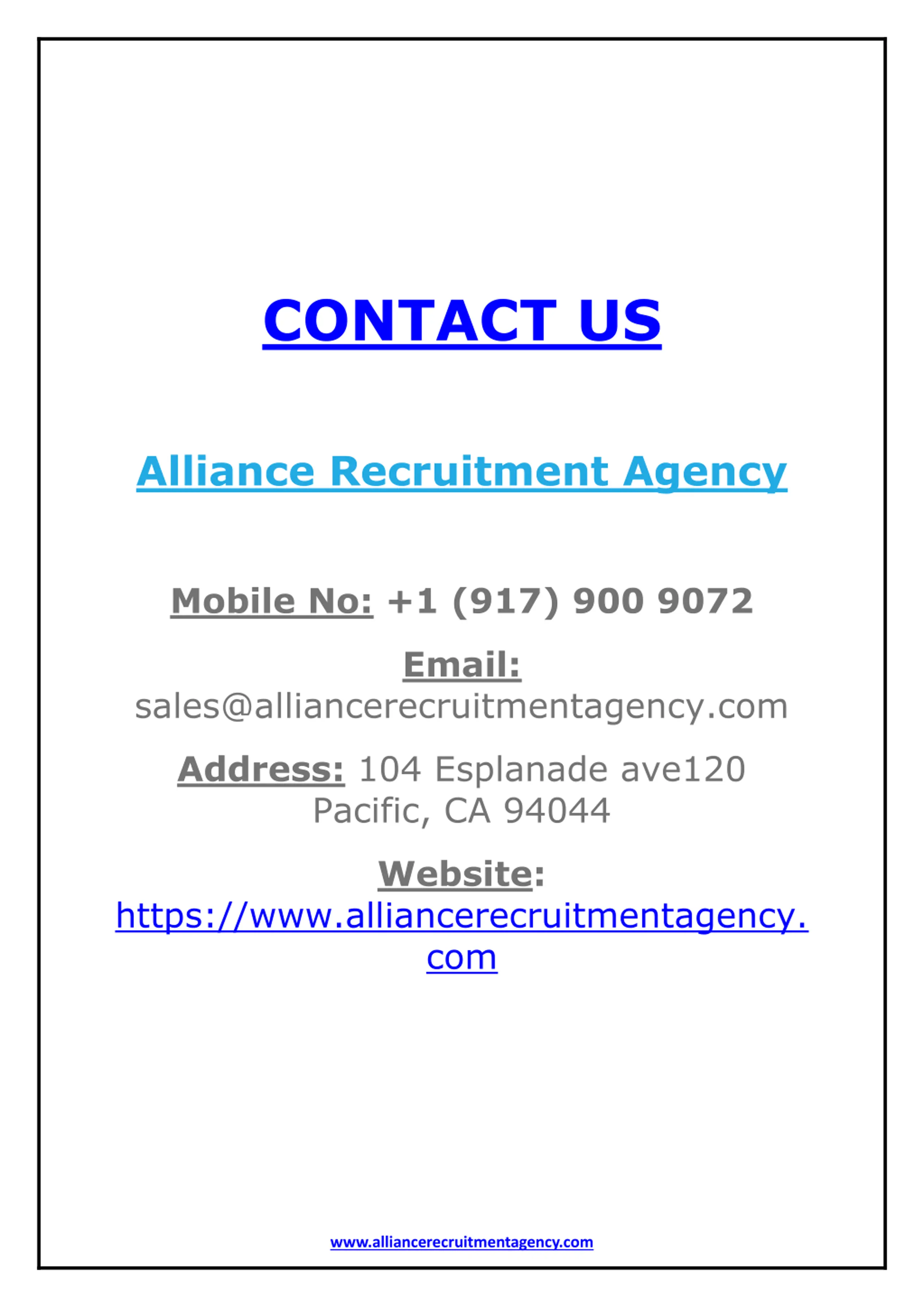 CONTACT US Alliance Recruitment Agency Mobile No: +1 (917) 900 9072 Email: sales@alliancerecruitmentagency.com Address: 104 Esplanade ave120 Pacific, CA 94044 Website: https://www.alliancerecruitmentagency. com www.alliancerecruitmentagency.com