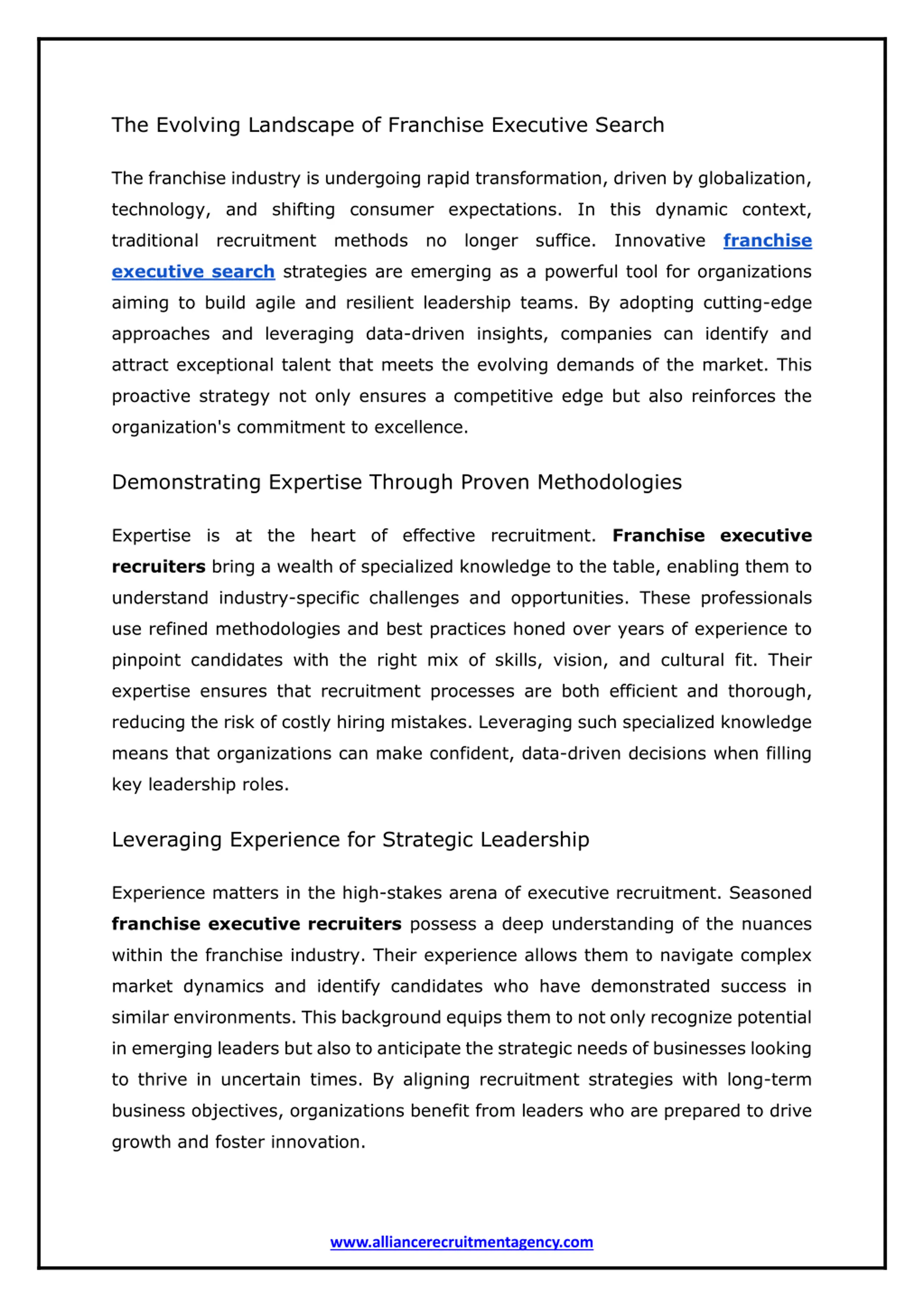 Establishing Authority with Data-Driven Insights In today s data-centric world, authority in recruitment is built on transparency, rigorous analysis, and measurable outcomes. Innovative franchise executive search strategies leverage advanced analytics and market intelligence to ensure that recruitment efforts are precise and targeted. This authoritative approach helps businesses to validate candidate credentials, benchmark performance, and make informed decisions. The integration of data-driven insights into the recruitment process not only bolsters confidence in hiring decisions but also reinforces the organization s reputation as a forward-thinking leader in the franchise industry. Building Trust Through Transparent Practices Trust is the cornerstone of any successful recruitment initiative. By embracing innovative practices in franchise executive search, companies demonstrate their commitment to ethical, transparent, and accountable recruitment processes. Franchise executive recruiters work diligently to maintain clear communication channels with both clients and candidates, ensuring that expectations are met and exceeded. This openness builds lasting relationships, fostering a culture of trust that extends throughout the organization. When stakeholders see that recruitment practices are fair and transparent, they are more likely to invest their confidence and resources in the company s future. Conclusion: A Vision for the Future Future-proofing your business with innovative franchise executive search strategies is not just a trend it s a strategic imperative. By partnering with expert franchise executive recruiters, organizations can secure leadership that is equipped to navigate the challenges of an ever-evolving market. Through expertise, experience, authority, and trust, modern recruitment strategies ensure that businesses remain agile, resilient, and ready for the future. Embracing these innovative approaches today will pave the way for sustainable growth and long- term success, making your organization a leader in the competitive franchise industry. www.alliancerecruitmentagency.com