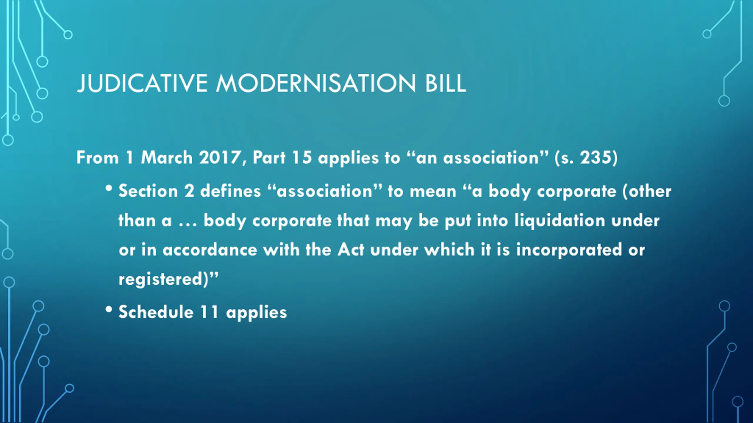 JUDICATIVE MODERNISATION BILL From 1 March 2017, Part 15 applies to an association (s. 235) Section 2 defines association to mean a body corporate (other than a body corporate that may be put into liquidation under or in accordance with the Act under which it is incorporated or registered) Schedule 11 applies