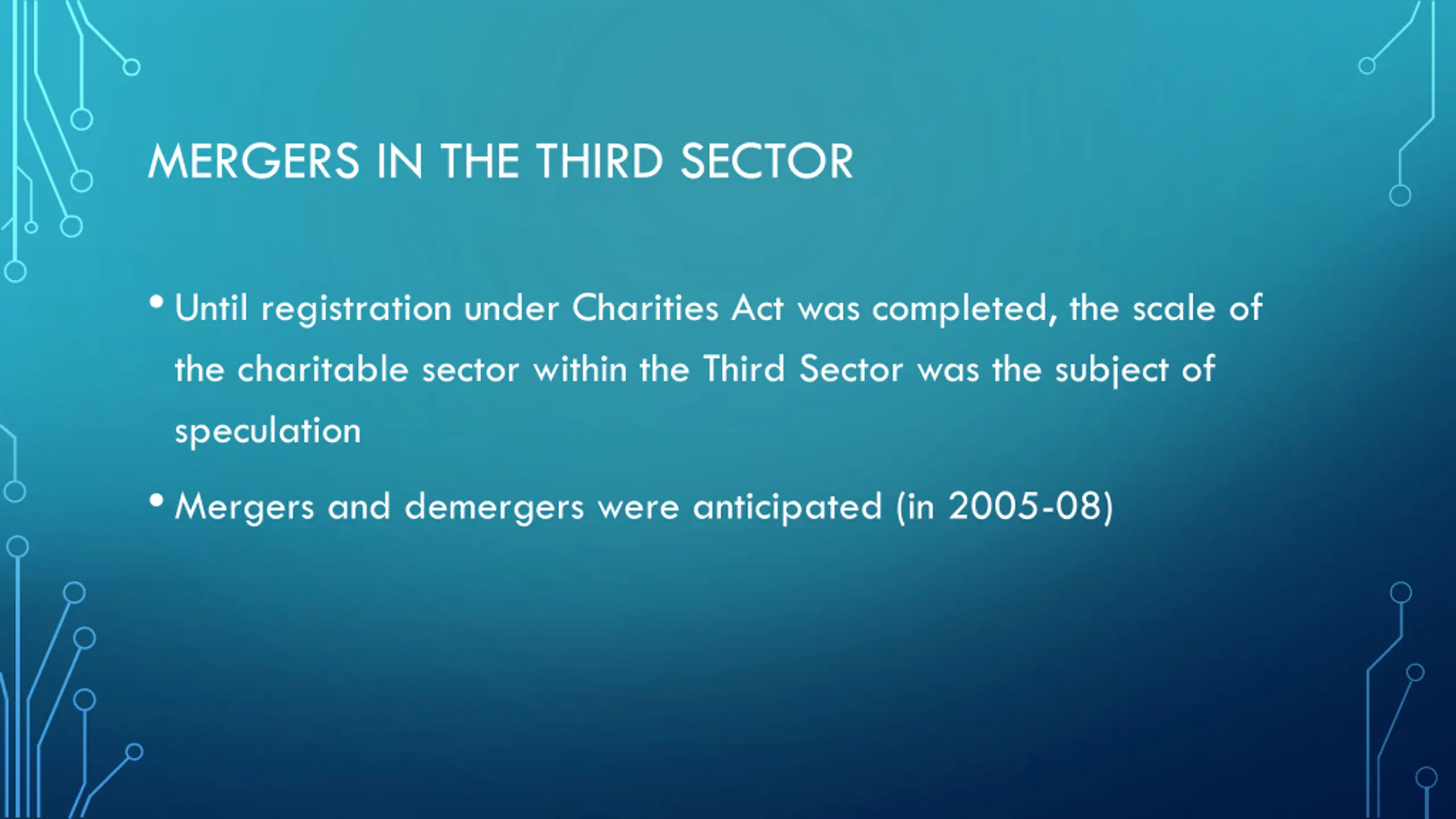 MERGERS IN THE THIRD SECTOR Until registration under Charities Act was completed, the scale of the charitable sector within the Third Sector was the subject of speculation Mergers and demergers were anticipated (in 2005-08)