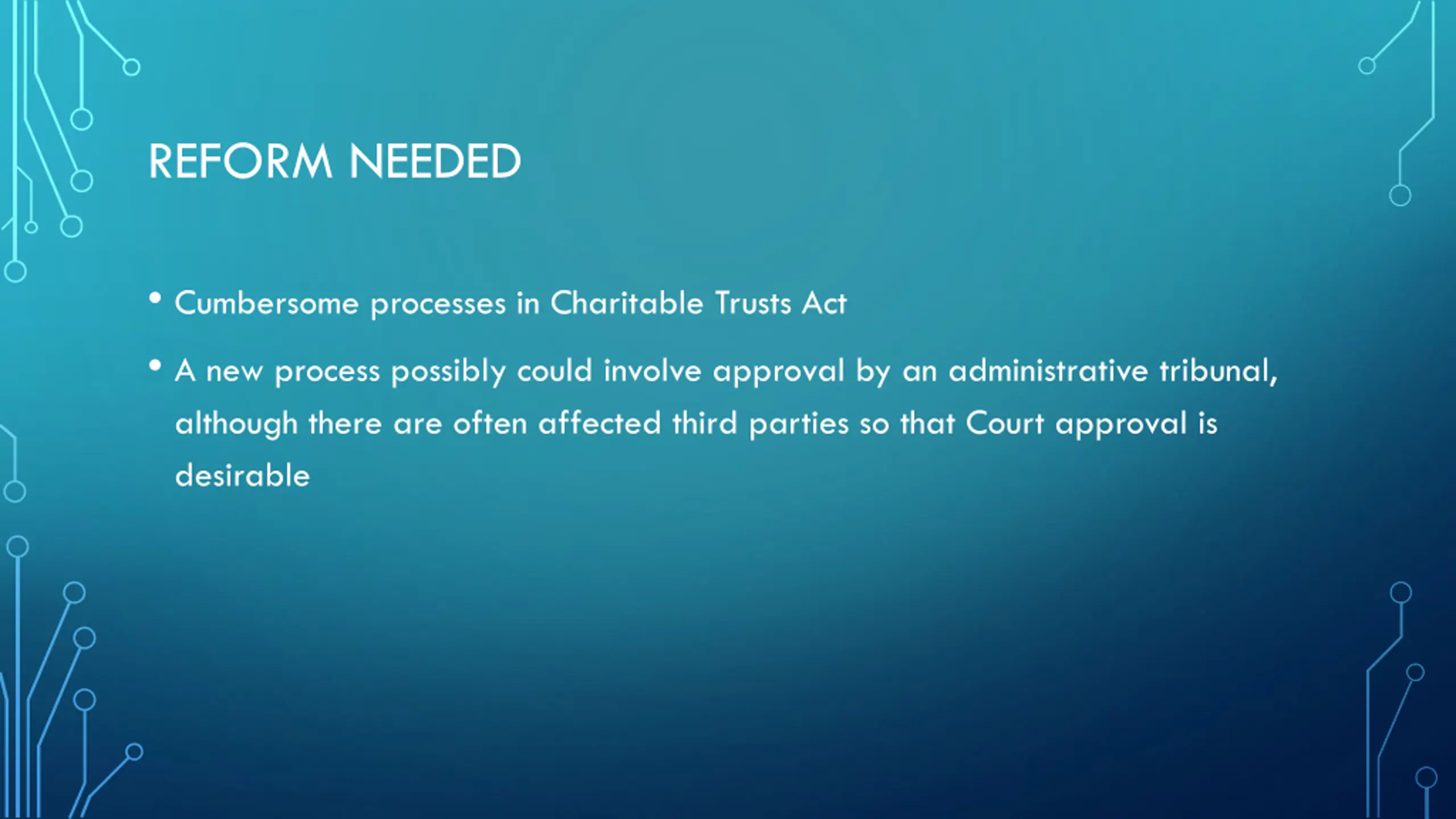 REFORM NEEDED Cumbersome processes in Charitable Trusts Act A new process possibly could involve approval by an administrative tribunal, although there are often affected third parties so that Court approval is desirable