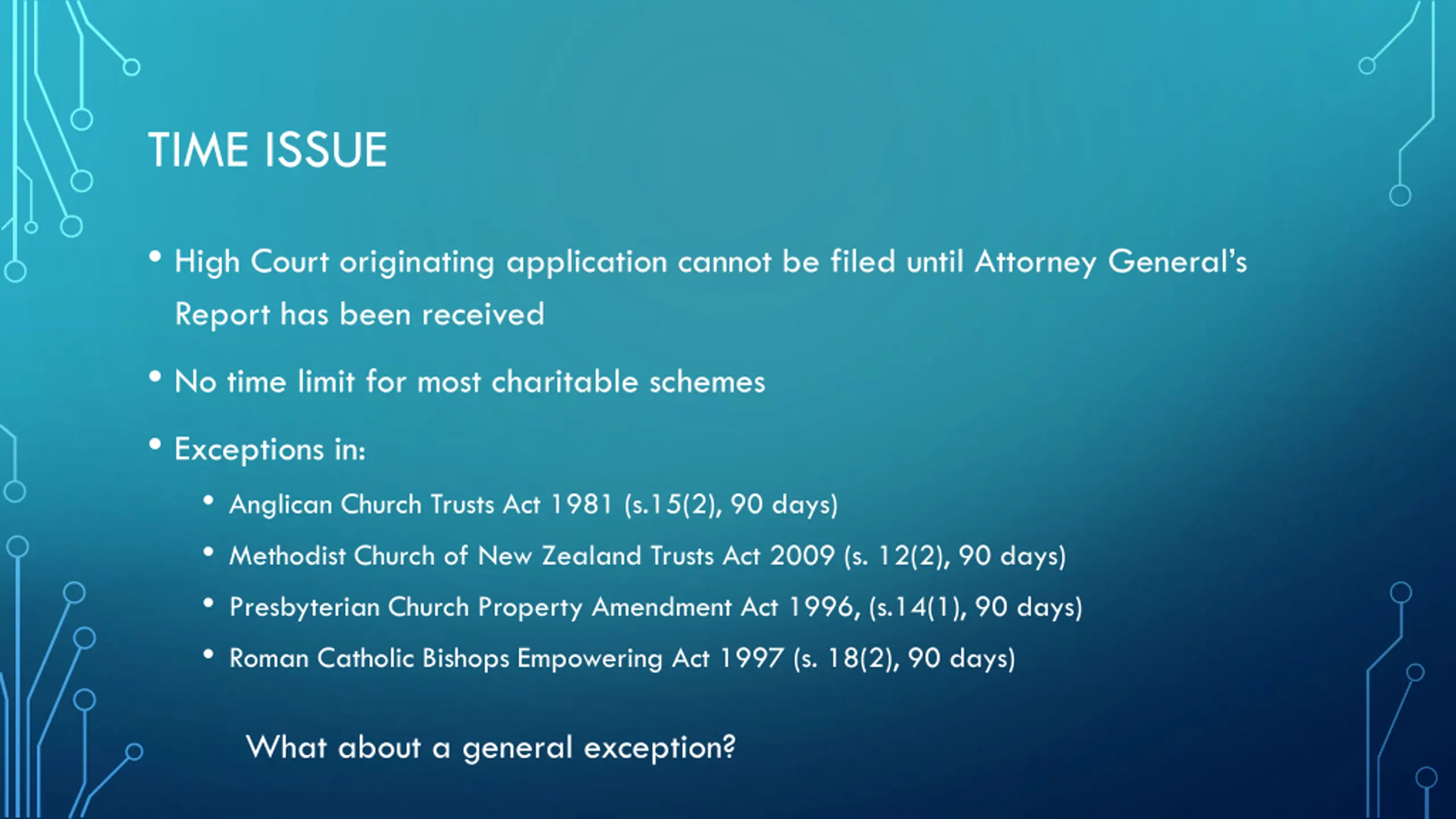 TIME ISSUE High Court originating application cannot be filed until Attorney General s Report has been received No time limit for most charitable schemes Exceptions in: Anglican Church Trusts Act 1981 (s.15(2), 90 days) Methodist Church of New Zealand Trusts Act 2009 (s. 12(2), 90 days) Presbyterian Church Property Amendment Act 1996, (s.14(1), 90 days) Roman Catholic Bishops Empowering Act 1997 (s. 18(2), 90 days) What about a general exception?