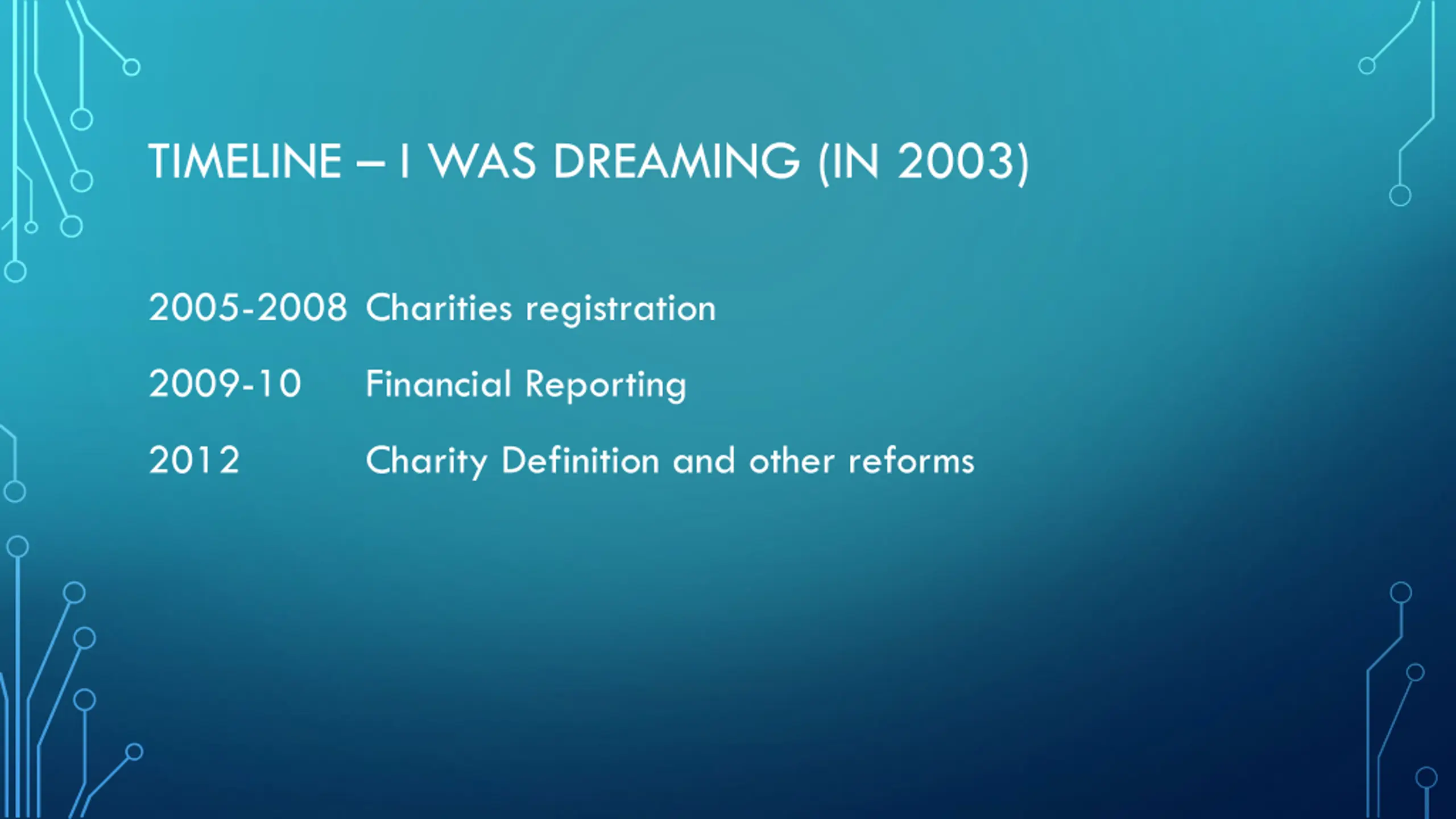 TIMELINE I WAS DREAMING (IN 2003) 2005-2008 Charities registration 2009-10 Financial Reporting 2012 Charity Definition and other reforms