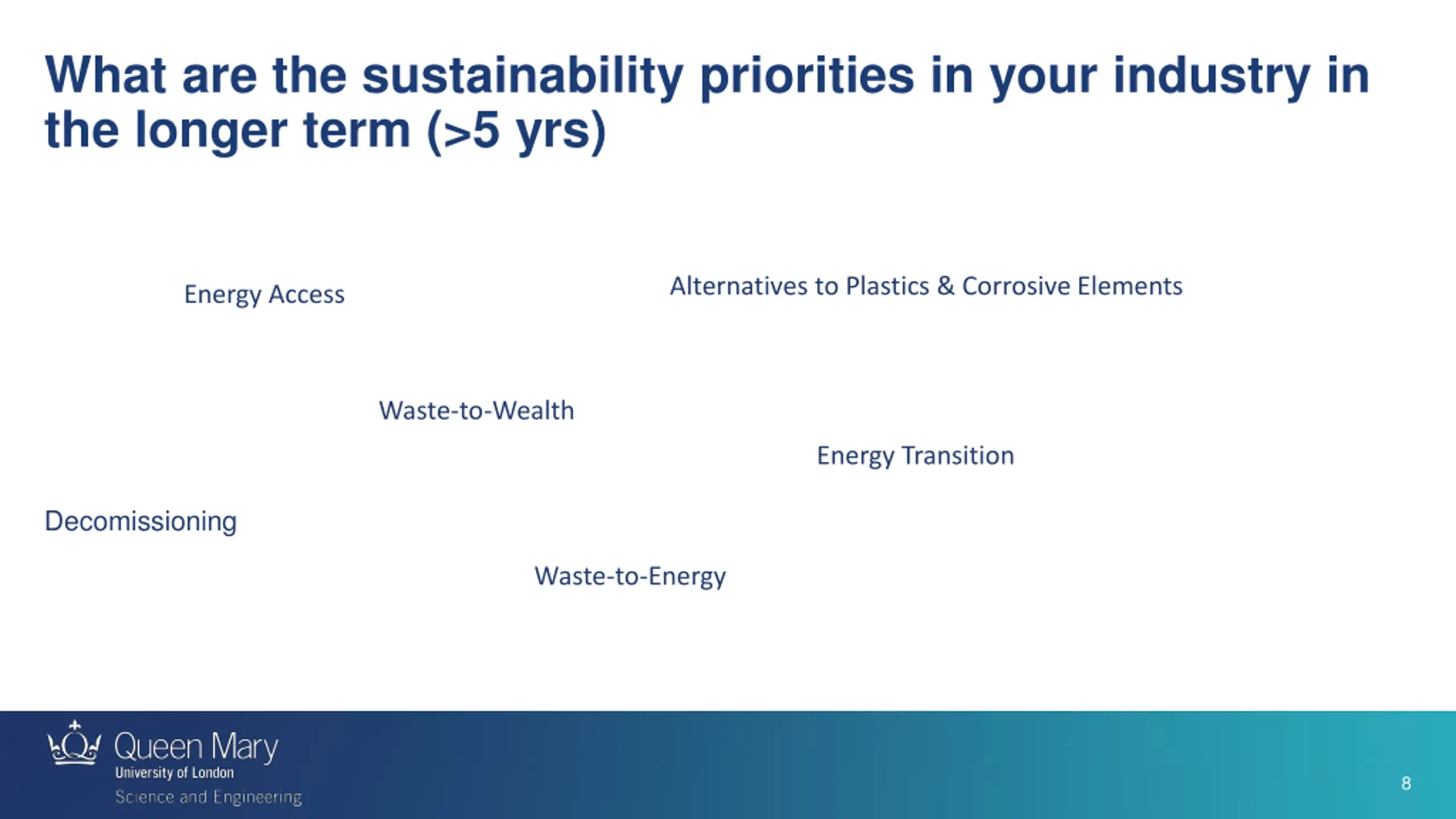 What are the sustainability priorities in your industry in the longer term (>5 yrs) Alternatives to Plastics & Corrosive Elements Energy Access Waste-to-Wealth Energy Transition Decomissioning Waste-to-Energy 8