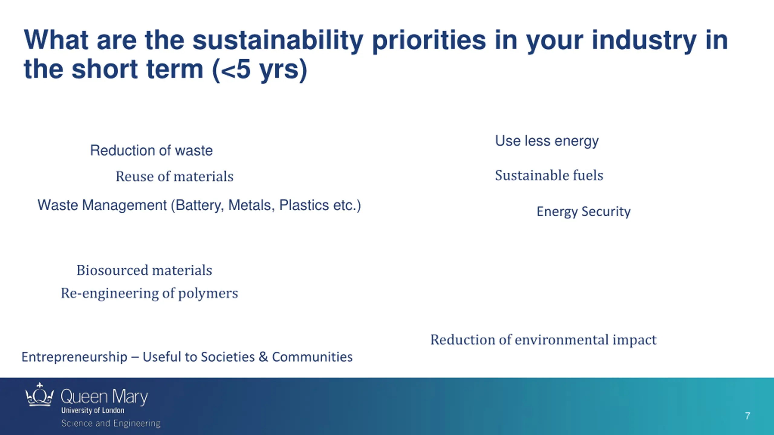 What are the sustainability priorities in your industry in the short term (<5 yrs) Use less energy Reduction of waste Sustainable fuels Reuse of materials Waste Management (Battery, Metals, Plastics etc.) Energy Security Biosourced materials Re-engineering of polymers Reduction of environmental impact Entrepreneurship Useful to Societies & Communities 7