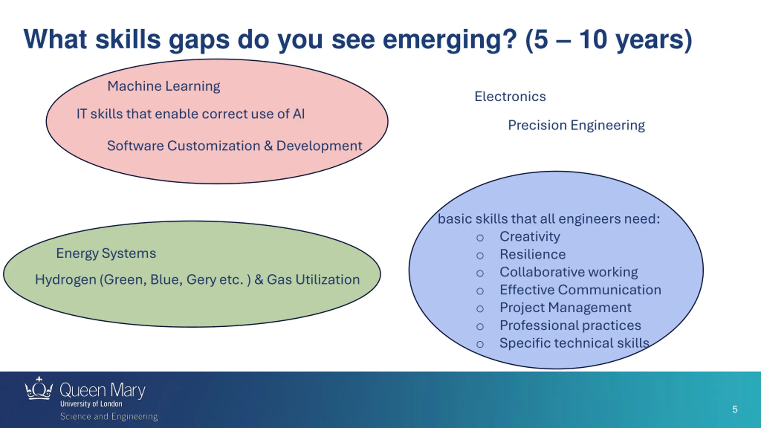 What skills gaps do you see emerging? (5 10 years) Machine Learning Electronics IT skills that enable correct use of AI Precision Engineering Software Customization & Development basic skills that all engineers need: o Creativity o Resilience o Collaborative working o Effective Communication o Project Management o Professional practices o Specific technical skills Energy Systems Hydrogen (Green, Blue, Gery etc. ) & Gas Utilization 5