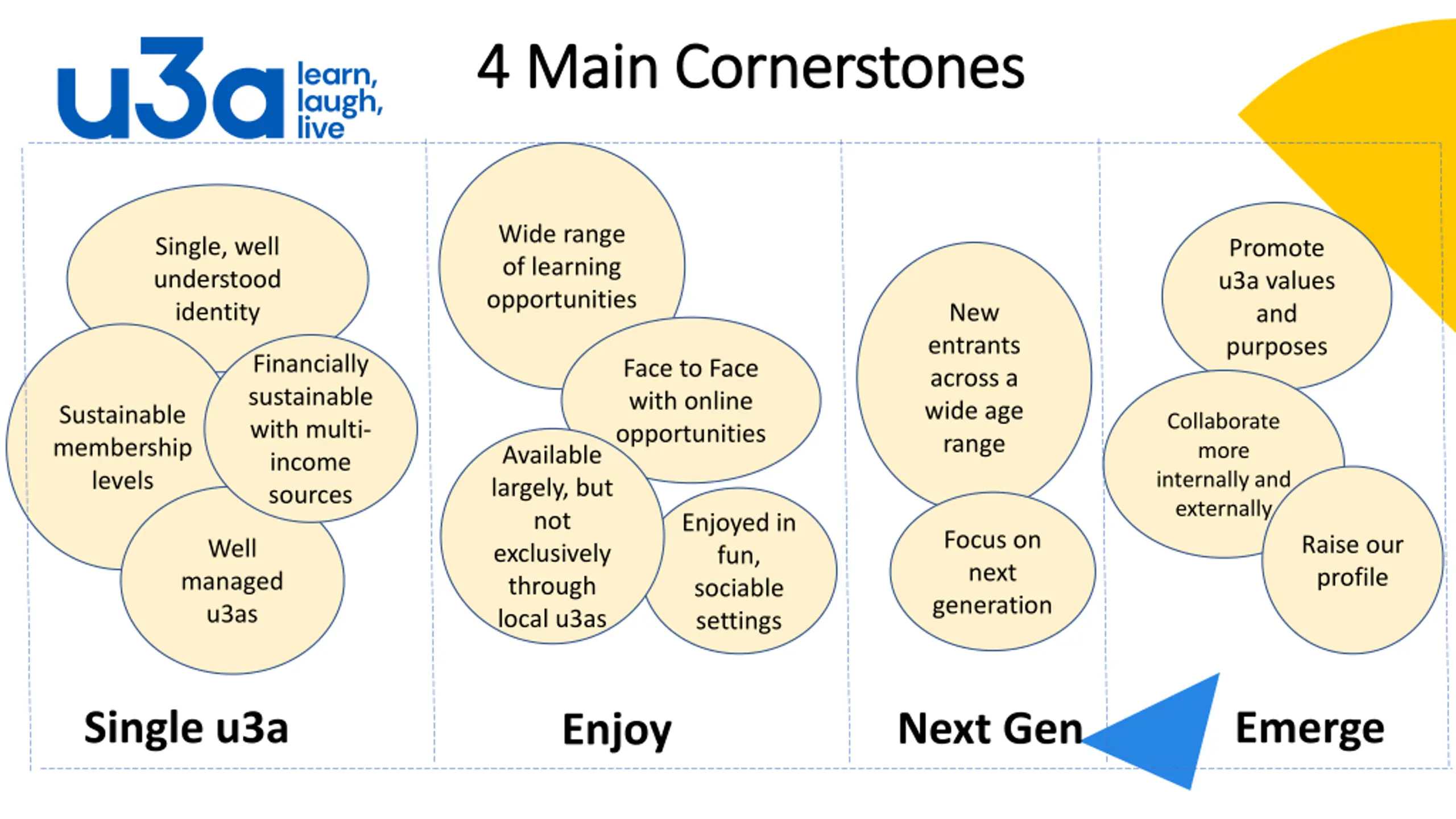 4 Main Cornerstones 4 Main Cornerstones Wide range of learning opportunities Single, well understood identity Promote u3a values and purposes New entrants across a wide age range Financially sustainable with multi- income sources Face to Face with online opportunities Sustainable membership levels Collaborate more internally and externally Available largely, but not exclusively through local u3as Enjoyed in fun, sociable settings Focus on next generation Raise our profile Well managed u3as Single u3a Emerge Next Gen Enjoy