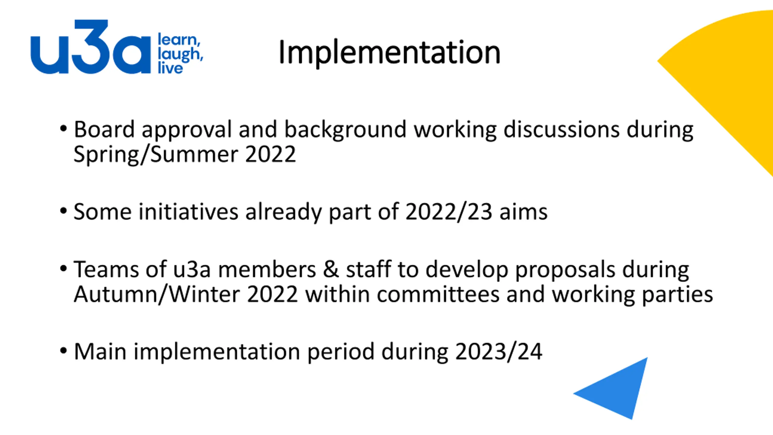 Implementation Implementation Board approval and background working discussions during Spring/Summer 2022 Some initiatives already part of 2022/23 aims Teams of u3a members & staff to develop proposals during Autumn/Winter 2022 within committees and working parties Main implementation period during 2023/24