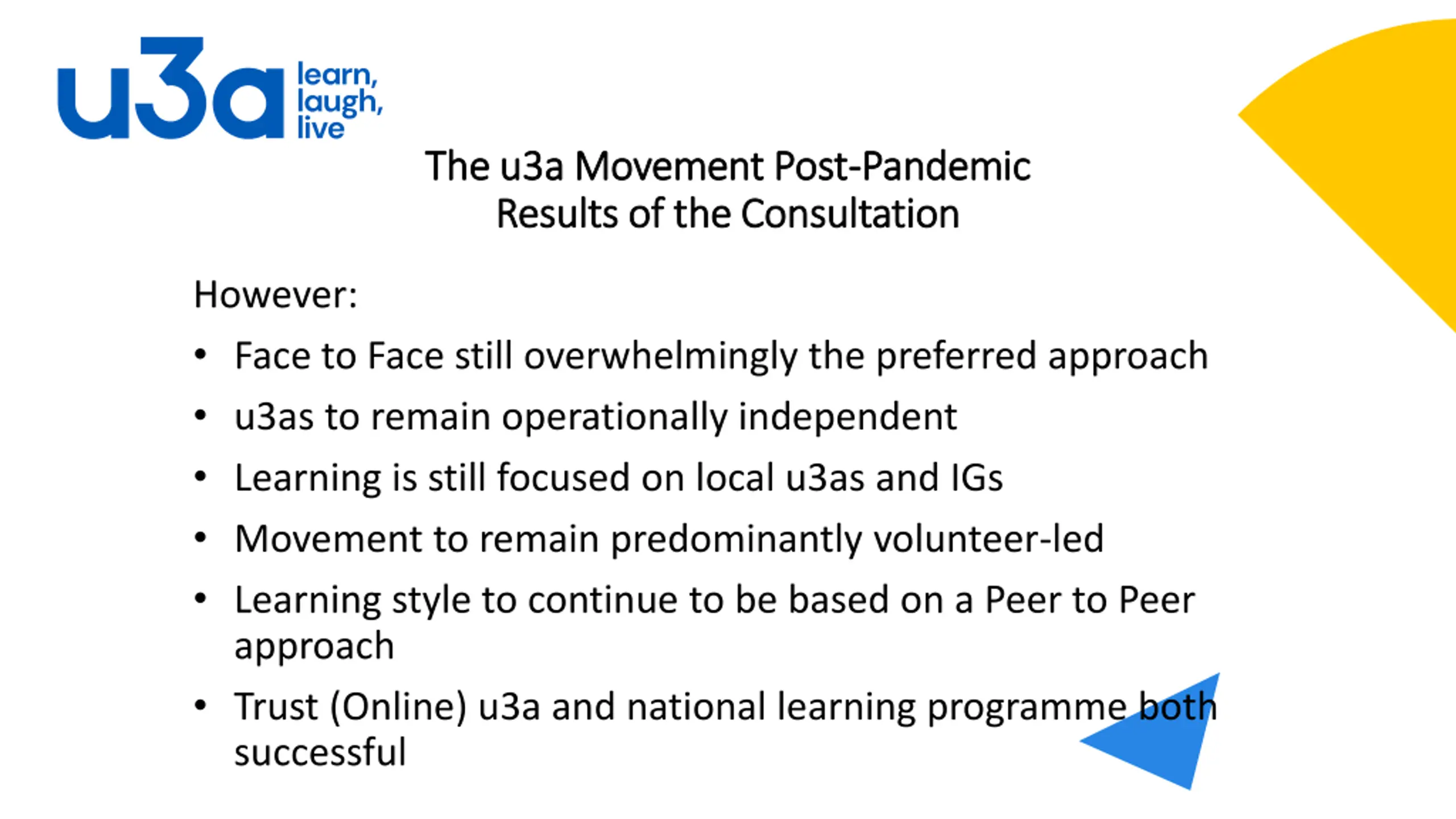 The u3a Movement Post The u3a Movement Post- -Pandemic Results of the Consultation Results of the Consultation Pandemic However: Face to Face still overwhelmingly the preferred approach u3as to remain operationally independent Learning is still focused on local u3as and IGs Movement to remain predominantly volunteer-led Learning style to continue to be based on a Peer to Peer approach Trust (Online) u3a and national learning programme both successful