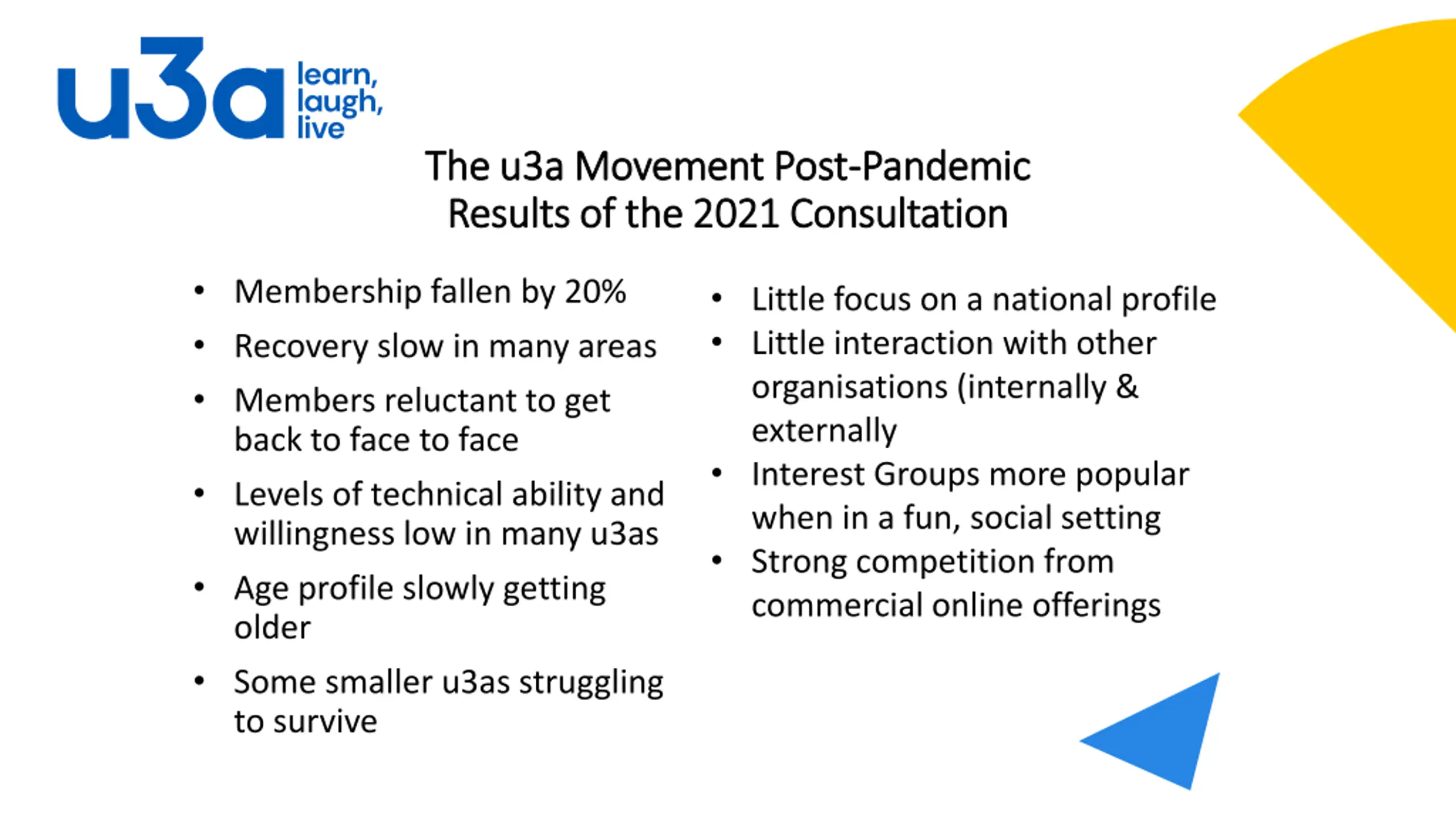 The u3a Movement Post The u3a Movement Post- -Pandemic Results of the 2021 Consultation Results of the 2021 Consultation Pandemic Membership fallen by 20% Recovery slow in many areas Members reluctant to get back to face to face Levels of technical ability and willingness low in many u3as Age profile slowly getting older Some smaller u3as struggling to survive Little focus on a national profile Little interaction with other organisations (internally & externally Interest Groups more popular when in a fun, social setting Strong competition from commercial online offerings