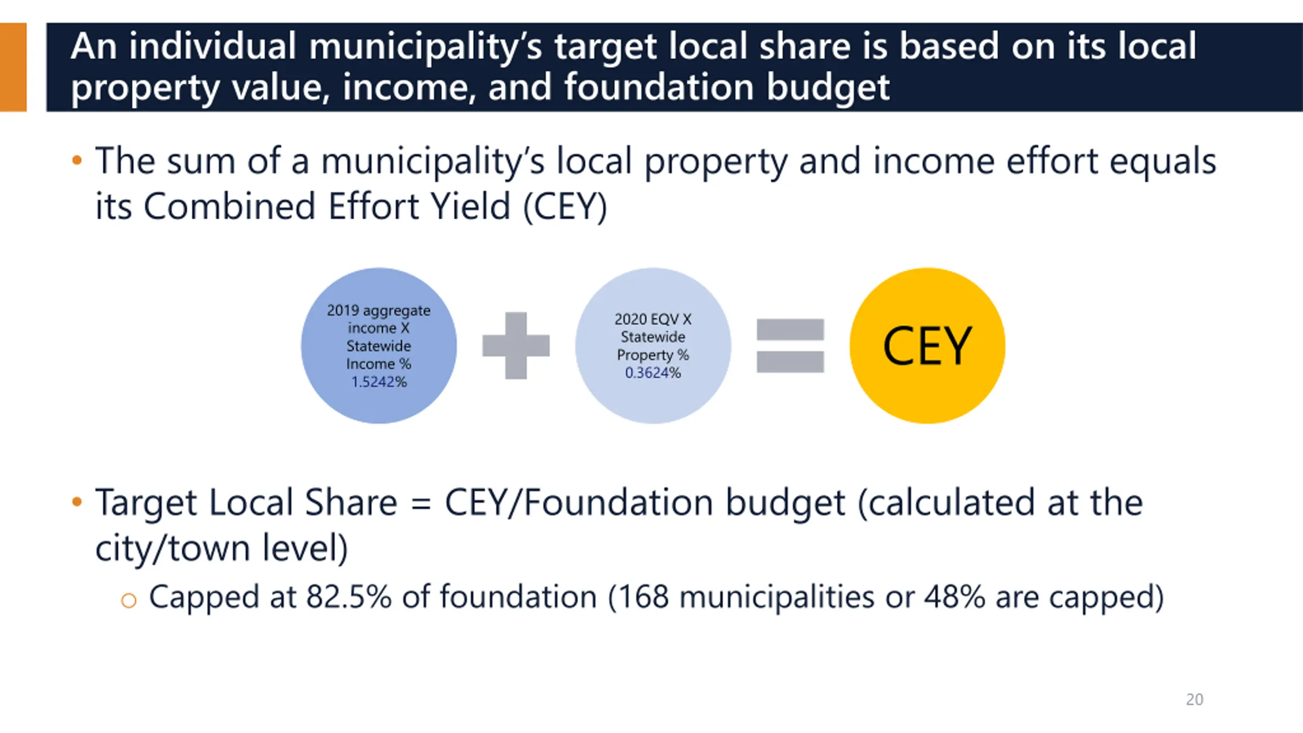 An individual municipalitys target local share is based on its local property value, income, and foundation budget The sum of a municipality s local property and income effort equals its Combined Effort Yield (CEY) 2019 aggregate income X Statewide Income % 1.5242% CEY 2020 EQV X Statewide Property % 0.3624% Target Local Share = CEY/Foundation budget (calculated at the city/town level) o Capped at 82.5% of foundation (168 municipalities or 48% are capped) 20