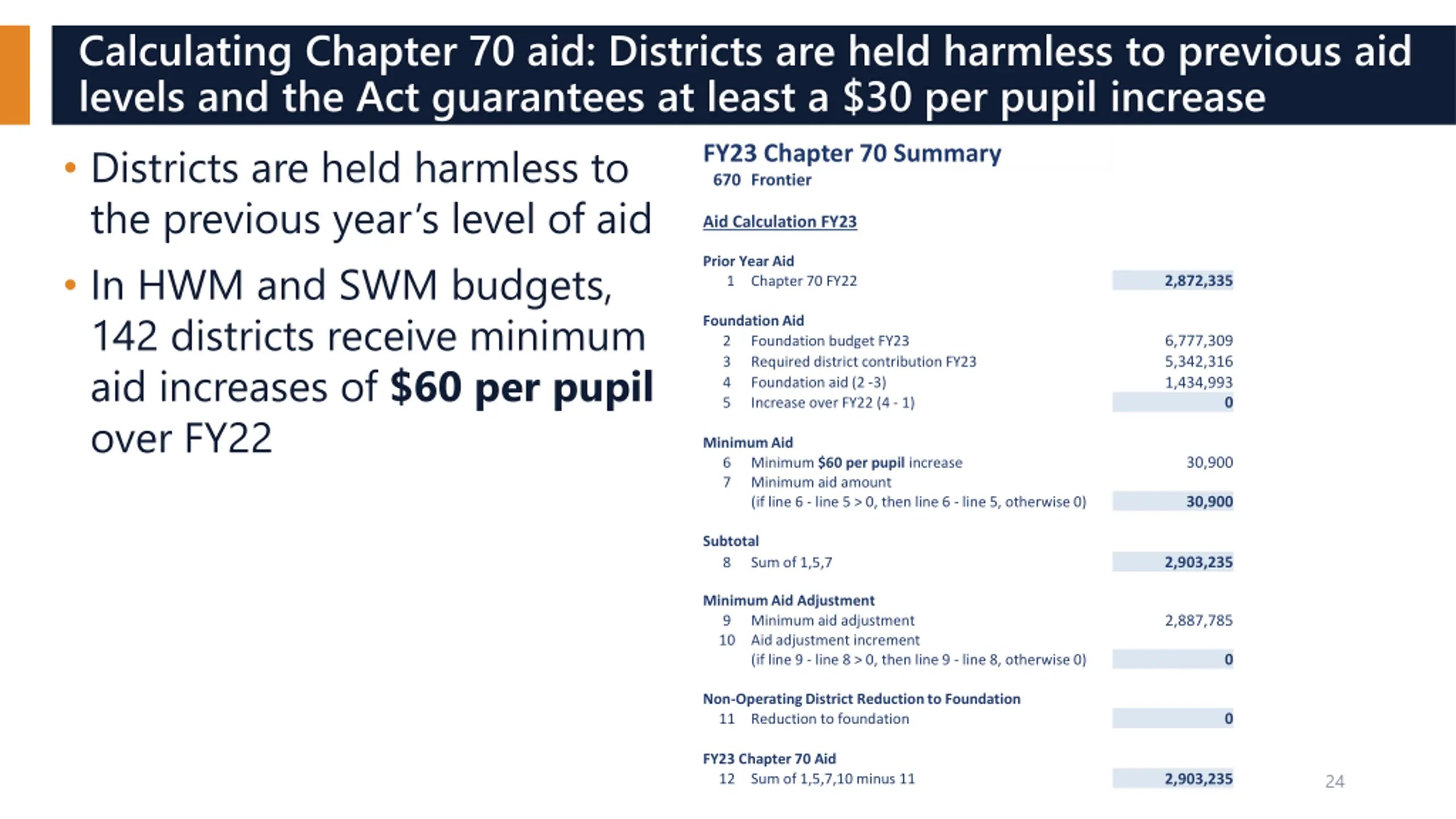 Calculating Chapter 70 aid: Districts are held harmless to previous aid levels and the Act guarantees at least a $30 per pupil increase Districts are held harmless to the previous year s level of aid In HWM and SWM budgets, 142 districts receive minimum aid increases of $60 per pupil over FY22 FY23 Chapter 70 Summary 670 Frontier Aid Calculation FY23 Prior Year Aid 1 Chapter 70 FY22 2,872,335 Foundation Aid 2 Foundation budget FY23 3 Required district contribution FY23 4 Foundation aid (2 -3) 5 Increase over FY22 (4 - 1) 6,777,309 5,342,316 1,434,993 0 Minimum Aid 6 7 30,900 Minimum $60 per pupil increase Minimum aid amount (if line 6 - line 5 > 0, then line 6 - line 5, otherwise 0) 30,900 Subtotal 8 2,903,235 Sum of 1,5,7 Minimum Aid Adjustment 9 Minimum aid adjustment 10 Aid adjustment increment (if line 9 - line 8 > 0, then line 9 - line 8, otherwise 0) 2,887,785 0 Non-Operating District Reduction to Foundation 11 Reduction to foundation 0 FY23 Chapter 70 Aid 12 Sum of 1,5,7,10 minus 11 24 2,903,235