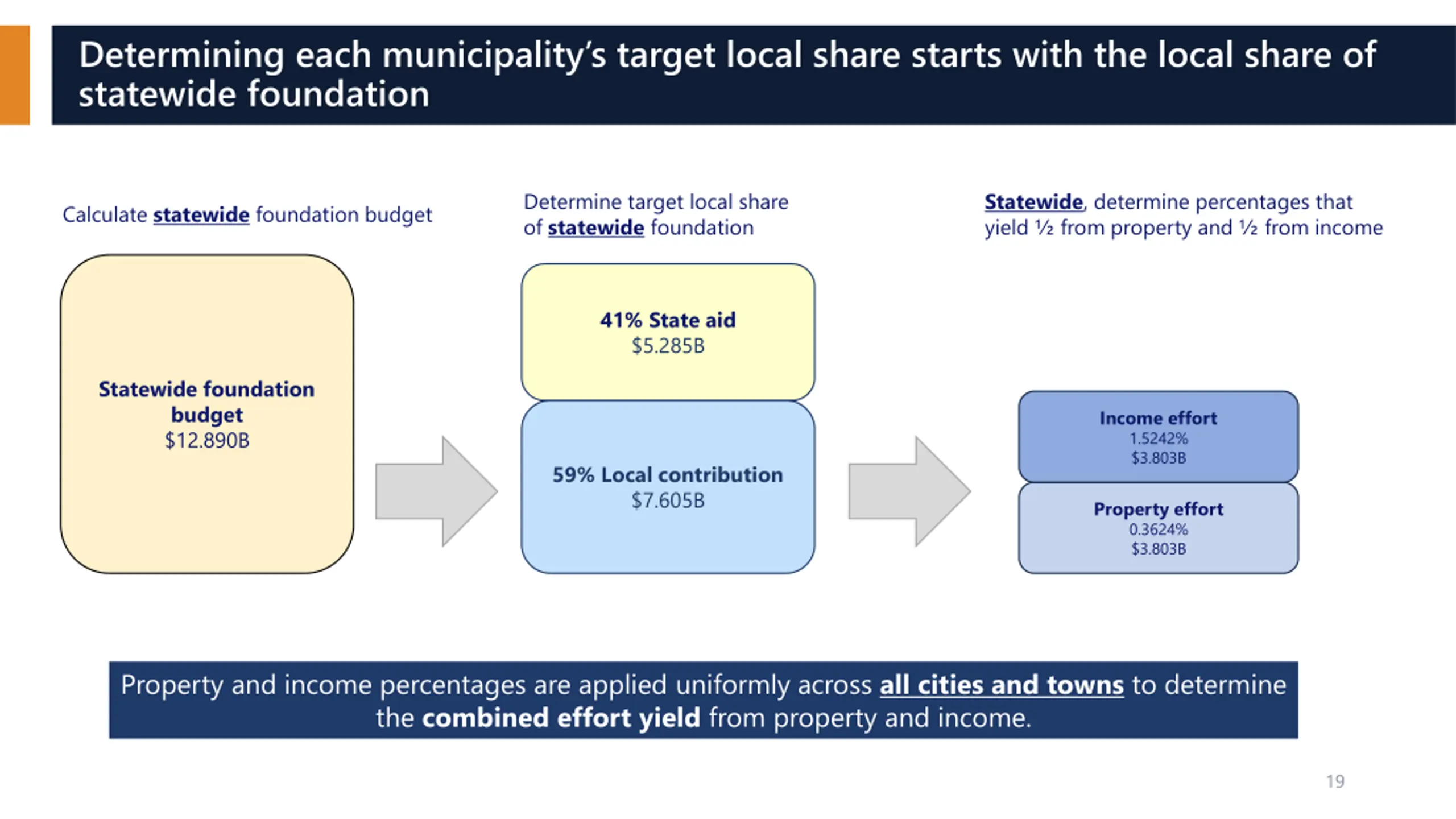 Determining each municipalitys target local share starts with the local share of statewide foundation Determine target local share of statewide foundation Statewide, determine percentages that yield from property and from income Calculate statewide foundation budget 41% State aid $5.285B Statewide foundation budget $12.890B Income effort 1.5242% $3.803B 59% Local contribution $7.605B Property effort 0.3624% $3.803B Property and income percentages are applied uniformly across all cities and towns to determine the combined effort yield from property and income. 19