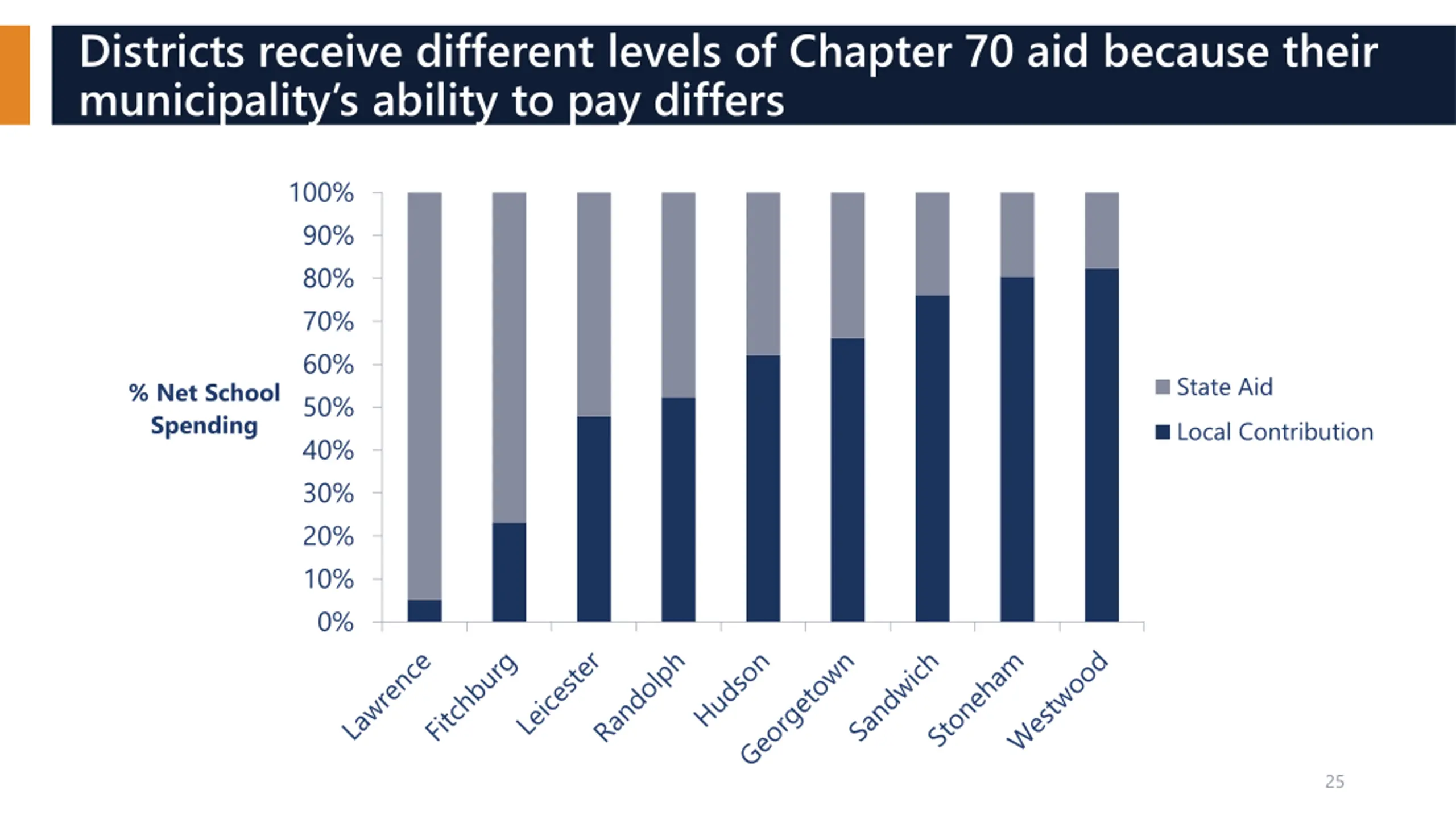 Districts receive different levels of Chapter 70 aid because their municipality s ability to pay differs 100% 90% 80% 70% 60% State Aid % Net School Spending 50% Local Contribution 40% 30% 20% 10% 0% 25