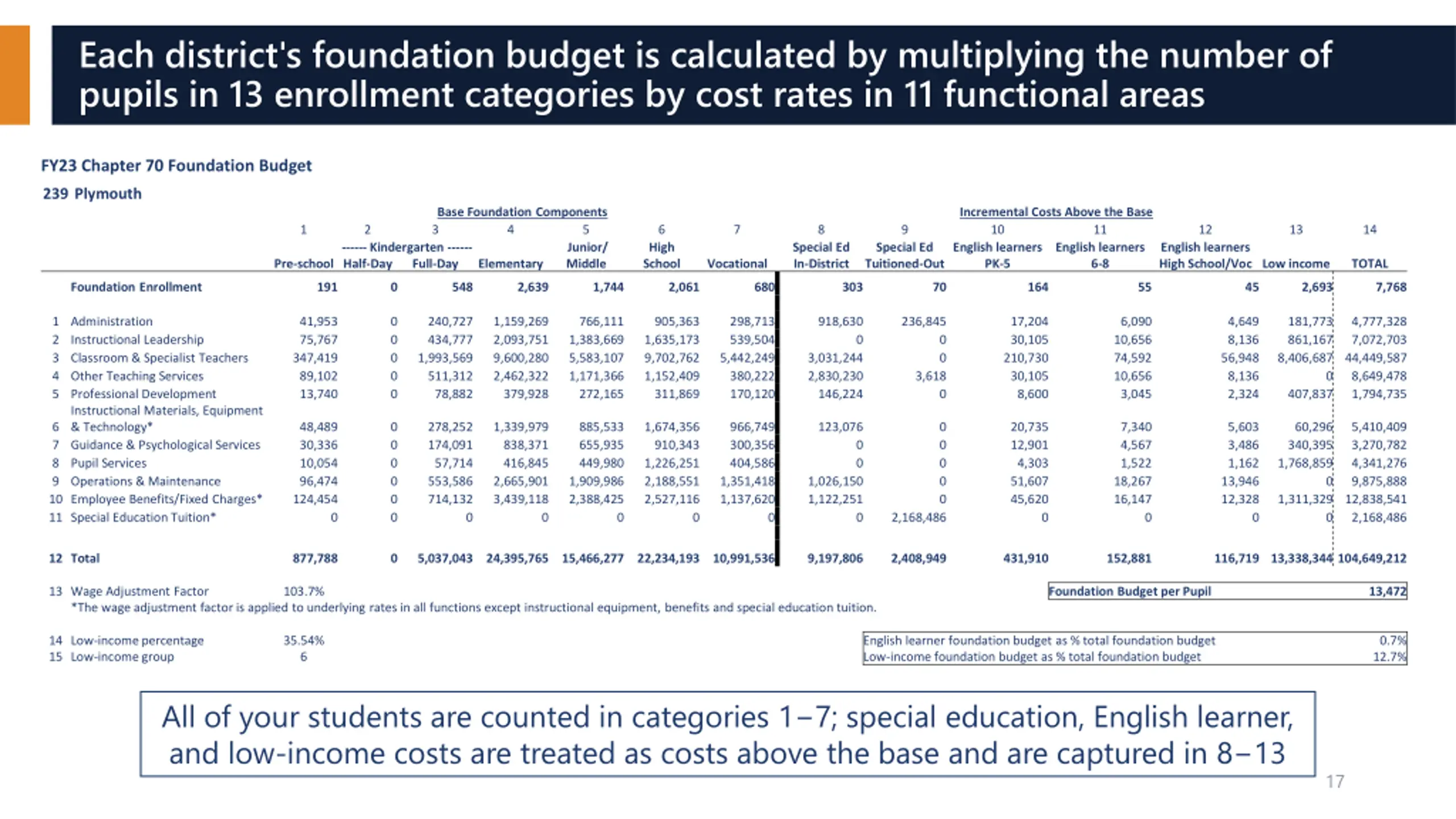 Each district's foundation budget is calculated by multiplying the number of pupils in 13 enrollment categories by cost rates in 11 functional areas FY23 Chapter 70 Foundation Budget 239 Plymouth 6 8 9 10 11 12 13 14 Base Foundation Components 3 4 Incremental Costs Above the Base 10 English learners PK-5 1 2 5 6 7 8 9 11 12 13 14 ------ Kindergarten ------ Junior/ Middle High School Special Ed In-District Special Ed Tuitioned-Out English learners 6-8 English learners High School/Voc Low income Pre-school Half-Day Full-Day Elementary Vocational TOTAL Foundation Enrollment 191 0 548 2,639 1,744 2,061 680 303 70 164 55 45 2,693 7,768 1 Administration 2 Instructional Leadership 3 Classroom & Specialist Teachers 4 Other Teaching Services 5 Professional Development Instructional Materials, Equipment & Technology* 7 Guidance & Psychological Services 8 Pupil Services 9 Operations & Maintenance 10 Employee Benefits/Fixed Charges* 11 Special Education Tuition* 41,953 75,767 347,419 89,102 13,740 0 0 0 0 0 240,727 434,777 1,993,569 511,312 78,882 1,159,269 2,093,751 9,600,280 2,462,322 379,928 766,111 1,383,669 5,583,107 1,171,366 272,165 905,363 1,635,173 9,702,762 1,152,409 311,869 298,713 539,504 5,442,249 380,222 170,120 918,630 236,845 17,204 30,105 210,730 30,105 8,600 6,090 10,656 74,592 10,656 3,045 4,649 8,136 56,948 8,136 2,324 181,773 861,167 8,406,687 44,449,587 0 407,837 4,777,328 7,072,703 0 0 0 3,031,244 2,830,230 146,224 3,618 8,649,478 1,794,735 0 6 48,489 30,336 10,054 96,474 124,454 0 0 0 0 0 0 278,252 174,091 57,714 553,586 714,132 1,339,979 838,371 416,845 2,665,901 3,439,118 885,533 655,935 449,980 1,909,986 2,388,425 1,674,356 910,343 1,226,251 2,188,551 2,527,116 966,749 300,356 404,586 1,351,418 1,137,620 123,076 0 0 0 0 0 20,735 12,901 4,303 51,607 45,620 7,340 4,567 1,522 18,267 16,147 5,603 3,486 1,162 13,946 12,328 60,296 340,395 1,768,859 5,410,409 3,270,782 4,341,276 9,875,888 0 0 1,026,150 1,122,251 0 1,311,329 12,838,541 0 0 0 0 0 0 0 0 2,168,486 0 0 0 2,168,486 12 Total 877,788 0 5,037,043 24,395,765 15,466,277 22,234,193 10,991,536 9,197,806 2,408,949 431,910 152,881 116,719 13,338,344 104,649,212 13 Wage Adjustment Factor *The wage adjustment factor is applied to underlying rates in all functions except instructional equipment, benefits and special education tuition. 103.7% Foundation Budget per Pupil 13,472 14 Low-income percentage 15 Low-income group 35.54% 6 English learner foundation budget as % total foundation budget Low-income foundation budget as % total foundation budget 0.7% 12.7% All of your students are counted in categories 1 7; special education, English learner, and low-income costs are treated as costs above the base and are captured in 8 13 17