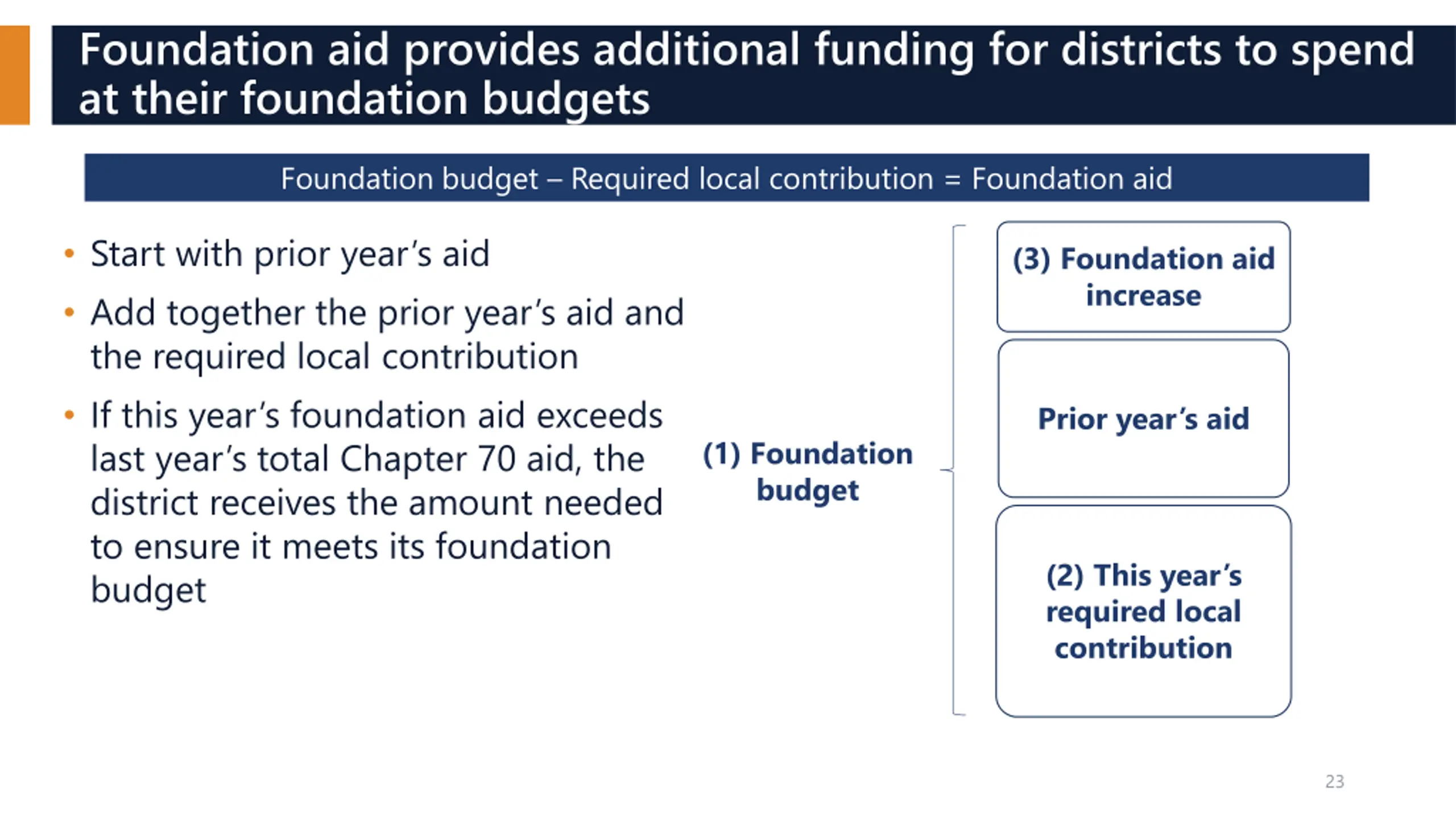Foundation aid provides additional funding for districts to spend at their foundation budgets Foundation budget Required local contribution = Foundation aid Start with prior year s aid Add together the prior year s aid and the required local contribution If this year s foundation aid exceeds last year s total Chapter 70 aid, the district receives the amount needed to ensure it meets its foundation budget (3) Foundation aid increase Prior year s aid (1) Foundation budget (2) This year s required local contribution 23