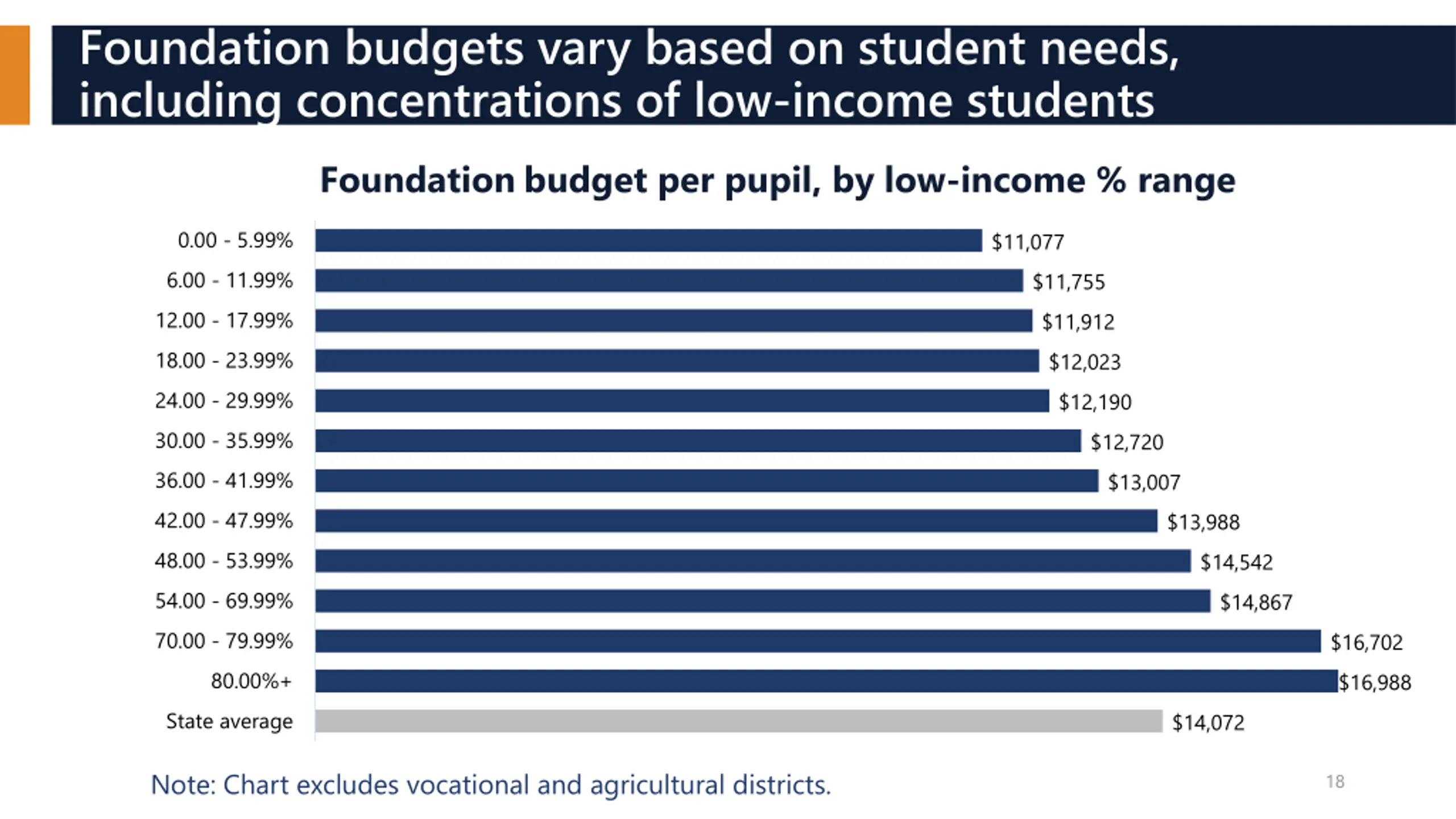 Foundation budgets vary based on student needs, including concentrations of low-income students Foundation budget per pupil, by low-income % range 0.00 - 5.99% $11,077 6.00 - 11.99% $11,755 12.00 - 17.99% $11,912 18.00 - 23.99% $12,023 24.00 - 29.99% $12,190 30.00 - 35.99% $12,720 36.00 - 41.99% $13,007 42.00 - 47.99% $13,988 48.00 - 53.99% $14,542 54.00 - 69.99% $14,867 70.00 - 79.99% $16,702 80.00%+ $16,988 State average $14,072 Note: Chart excludes vocational and agricultural districts. 18