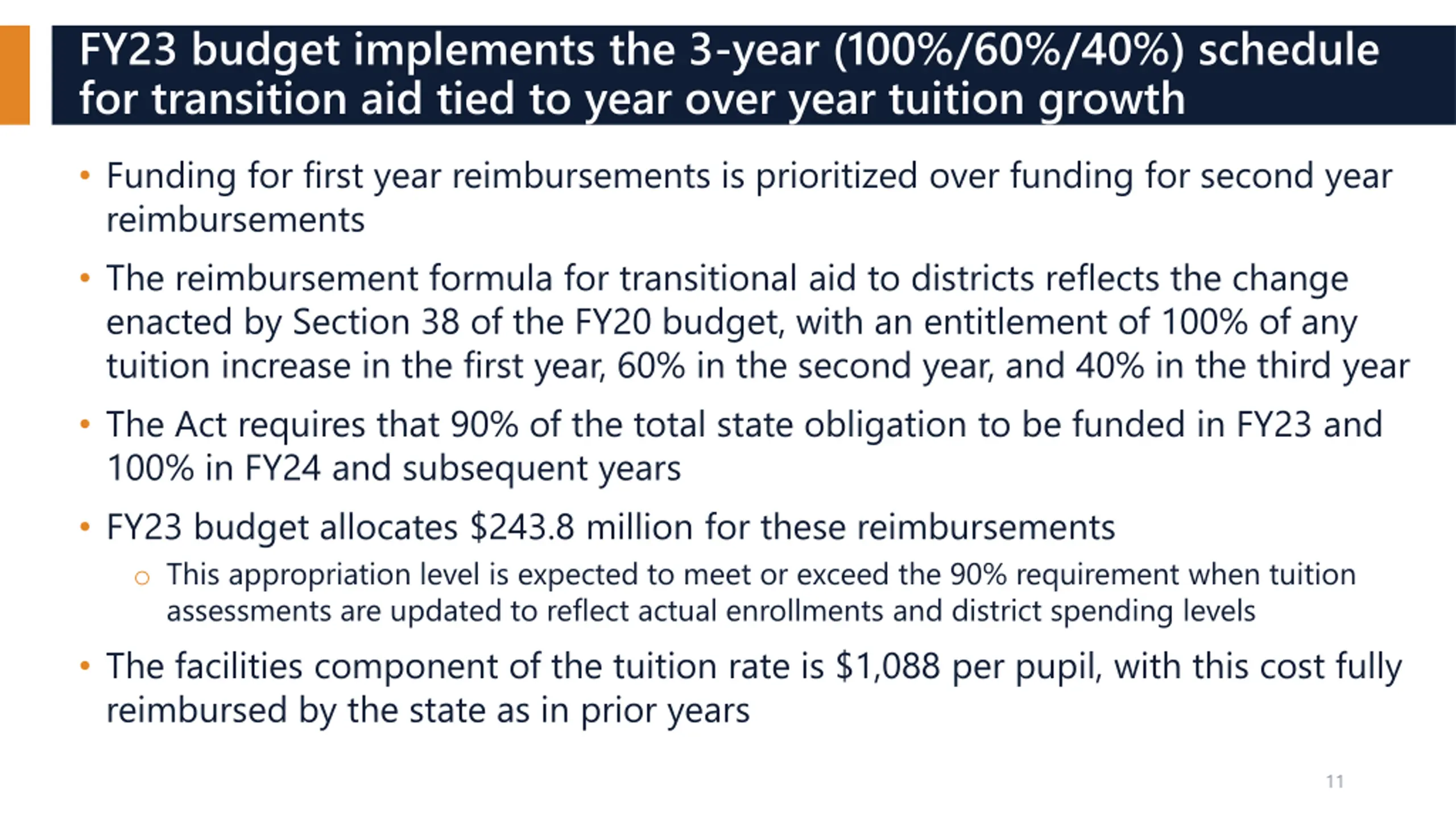 FY23 budget implements the 3-year (100%/60%/40%) schedule for transition aid tied to year over year tuition growth Funding for first year reimbursements is prioritized over funding for second year reimbursements The reimbursement formula for transitional aid to districts reflects the change enacted by Section 38 of the FY20 budget, with an entitlement of 100% of any tuition increase in the first year, 60% in the second year, and 40% in the third year The Act requires that 90% of the total state obligation to be funded in FY23 and 100% in FY24 and subsequent years FY23 budget allocates $243.8 million for these reimbursements o This appropriation level is expected to meet or exceed the 90% requirement when tuition assessments are updated to reflect actual enrollments and district spending levels The facilities component of the tuition rate is $1,088 per pupil, with this cost fully reimbursed by the state as in prior years 11