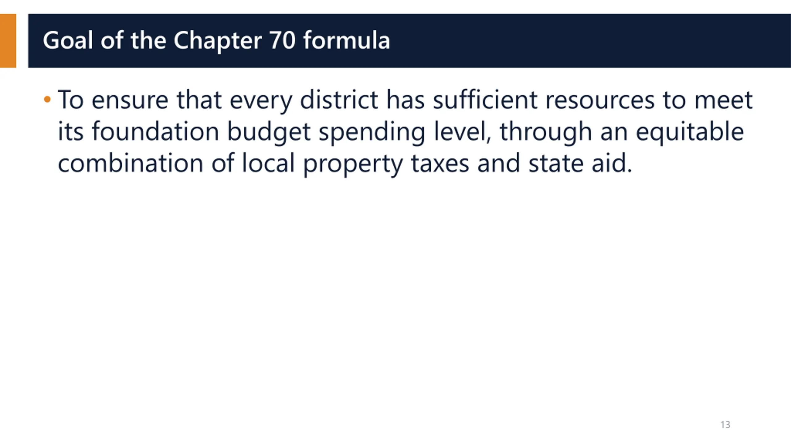 Goal of the Chapter 70 formula To ensure that every district has sufficient resources to meet its foundation budget spending level, through an equitable combination of local property taxes and state aid. 13