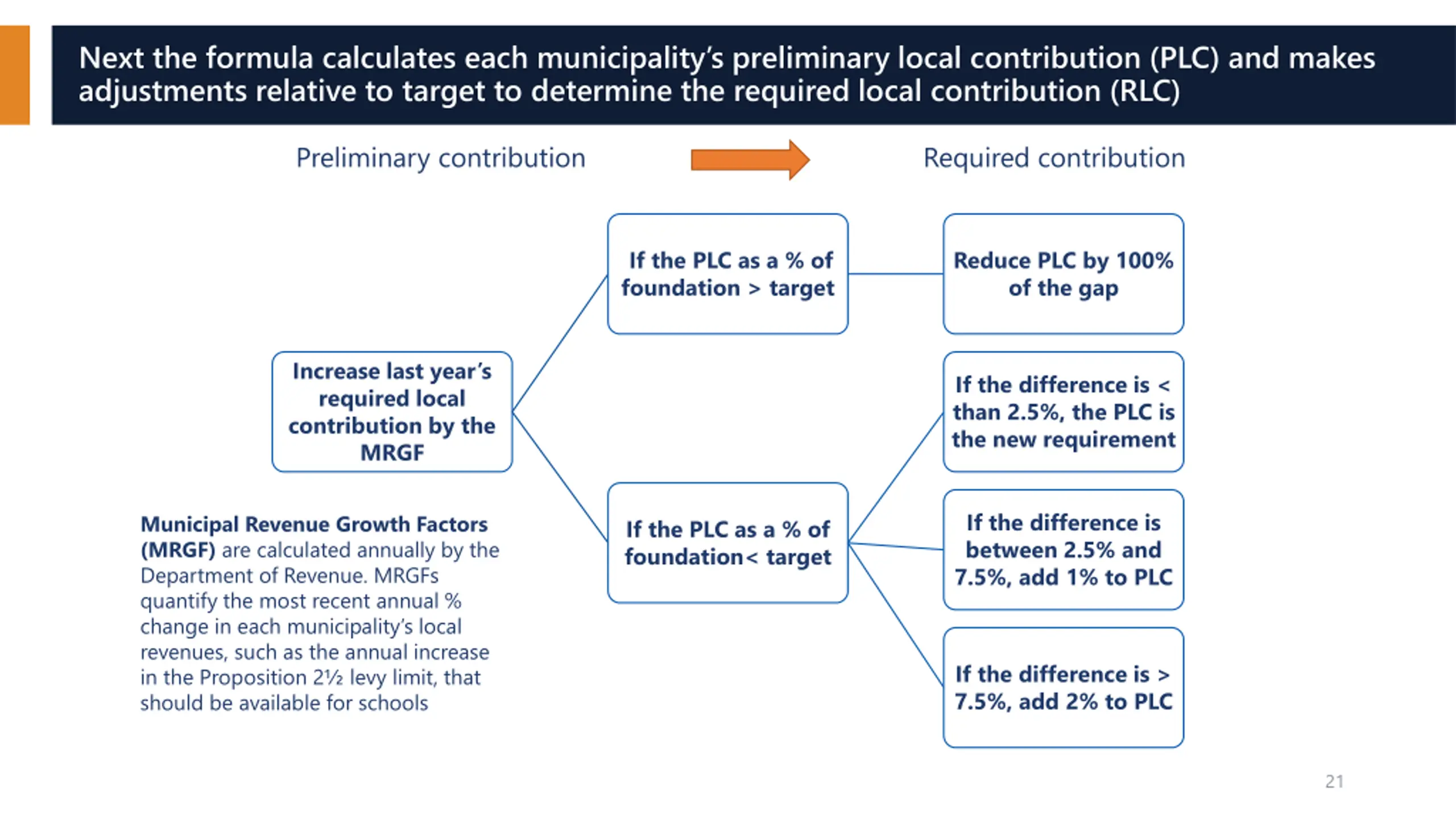 Next the formula calculates each municipalitys preliminary local contribution (PLC) and makes adjustments relative to target to determine the required local contribution (RLC) Preliminary contribution Required contribution If the PLC as a % of foundation > target Reduce PLC by 100% of the gap Increase last year s required local contribution by the MRGF If the difference is < than 2.5%, the PLC is the new requirement If the difference is between 2.5% and 7.5%, add 1% to PLC Municipal Revenue Growth Factors (MRGF) are calculated annually by the Department of Revenue. MRGFs quantify the most recent annual % change in each municipality s local revenues, such as the annual increase in the Proposition 2 levy limit, that should be available for schools If the PLC as a % of foundation< target If the difference is > 7.5%, add 2% to PLC 21